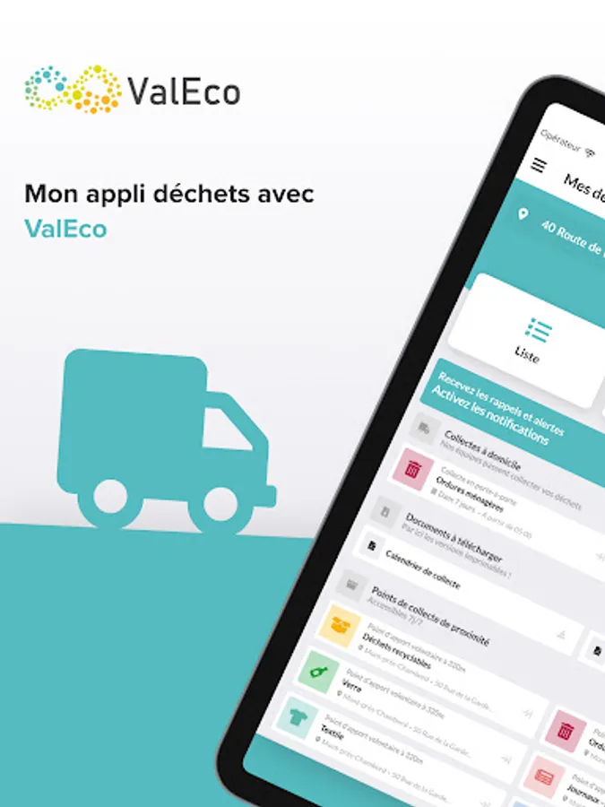 The My Waste application - ValEco is the new official application for your waste services! It lists all the information you need to sort and reduce your waste, depending on your address: personalized collection schedule, location and availability of sorting points, timetables and practical information on waste collection centers, sorting instructions and much more.