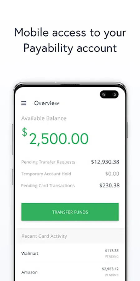 Introducing the free Payability Mobile app! Use the app to check your Payability available balance, review your recent seller card transactions, and transfers funds - all on your schedule, at your convenience. Simply log in using your Payability account email and password to get started.