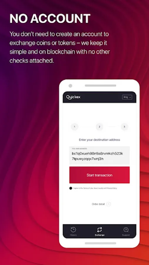 You don’t need to create an account to exchange coins or tokens – we keep it simple and on blockchain with no other checks attached.