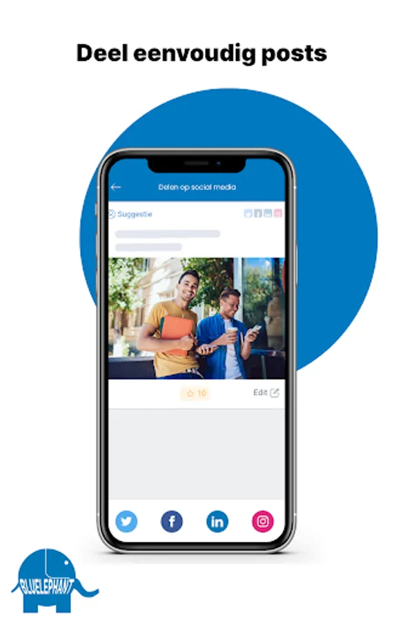BluElephant app is a Social branding app that you can use strategically to publish, analyze, advertise and collaborate with all teams of the organization. You convert authentic stories from an employee or other stakeholders into unique social media content that can be shared by everyone within the organization. The platform is also ideally suited for a strategic, top-down social media approach. Whether you want to involve employees, franchise entrepreneurs, resellers or other stakeholders in the use of social media. With BluElephant app you create an enormously relevant reach-through personal channels and business channels of all people involved.