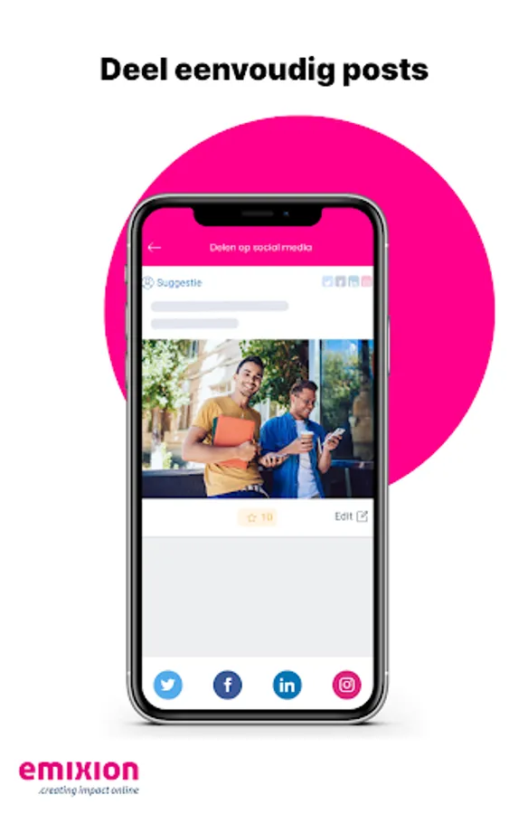 Emixion is a Social branding app that you can use strategically to publish, analyze, advertise and collaborate with all teams of the organization. You convert authentic stories from an employee or other stakeholders into unique social media content that can be shared by everyone within the organization. The platform is also ideally suited for a strategic, top-down social media approach. Whether you want to involve employees, franchise entrepreneurs, resellers or other stakeholders in the use of social media. With Emixion you create an enormously relevant reach-through personal channels and business channels of all people involved.