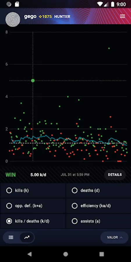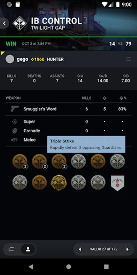 Review results for up to 100 recent games in Glory, Valor, or Trials of Osiris, including average stats for k/d, efficiency (ka/d), kills, assists, and opponents defeated.