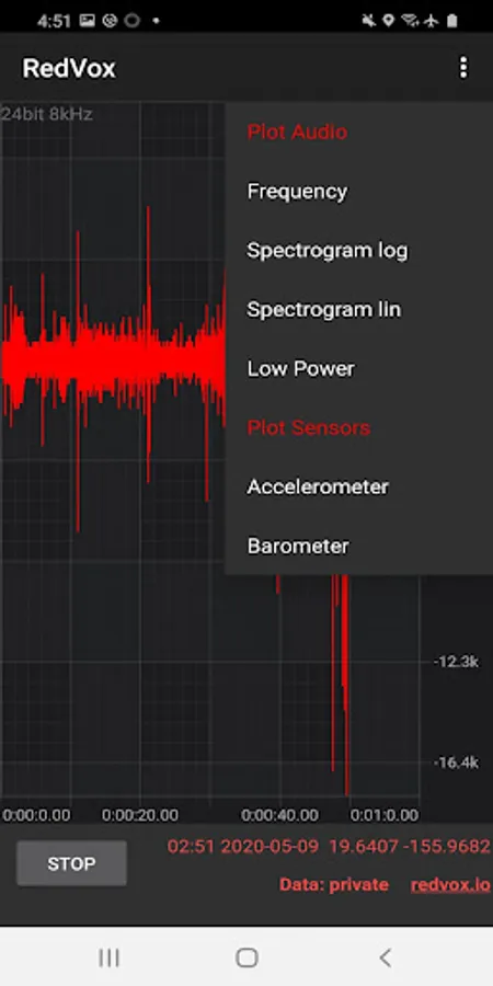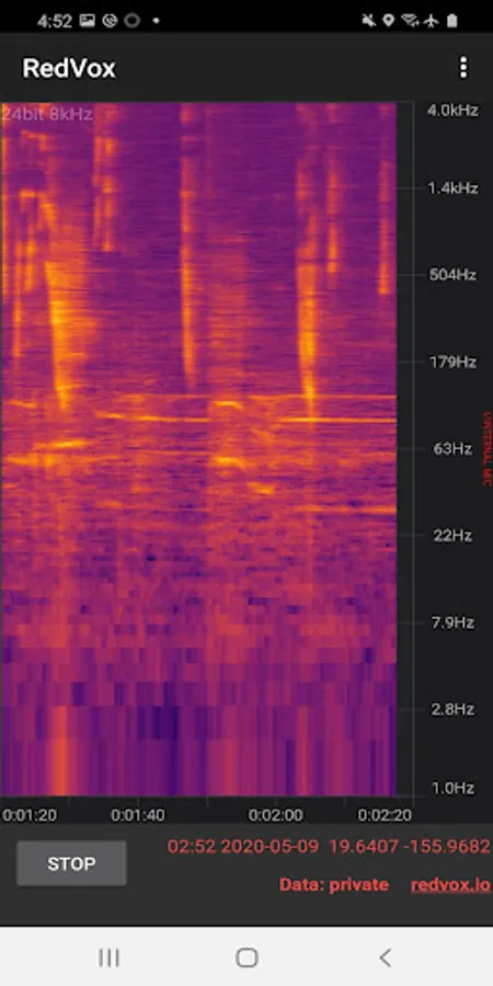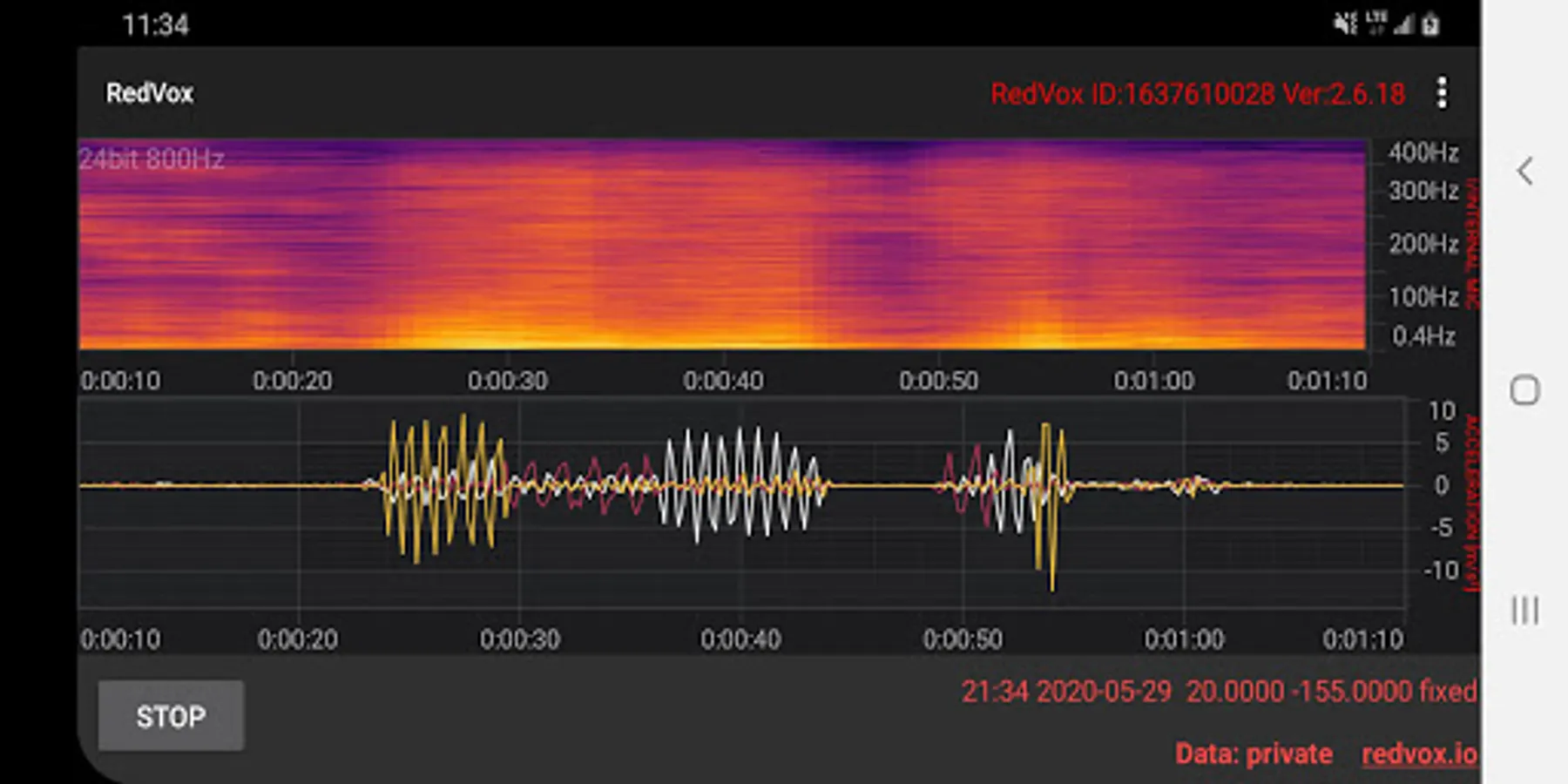 RedVox Recorder can record in the background to continuously monitor infrasound events and ambient noise. Although continued recording will consume more power, with the screen off it can run off the internal battery for many hours.