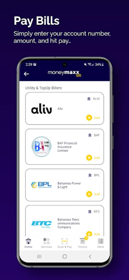 MoneyMaxx mobile wallet is an app designed to facilitate person-to-person transfers as well as payments to businesses where our mobile wallet credit is accepted. MoneyMaxx mobile wallet allows you to pay utility bills from anywhere with confirmation directly in app. You can use MoneyMaxx at participating businesses and with individuals who have the wallet anywhere in The Bahamas. MoneyMaxx - helping you make your dollars do more!