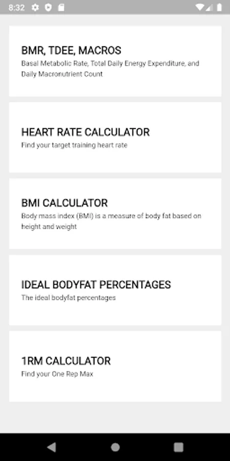 Calculate your BMI, BMR, TDEE, macronutrient count, target heart rate, and your 1RPM. There is more to come!