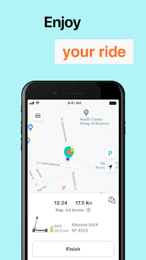 - enjoy the traffic and don't worry about traffic jams or finding free Parking, you can Park your scooter in any of the thousands of Parking lots around you marked with our brand name.