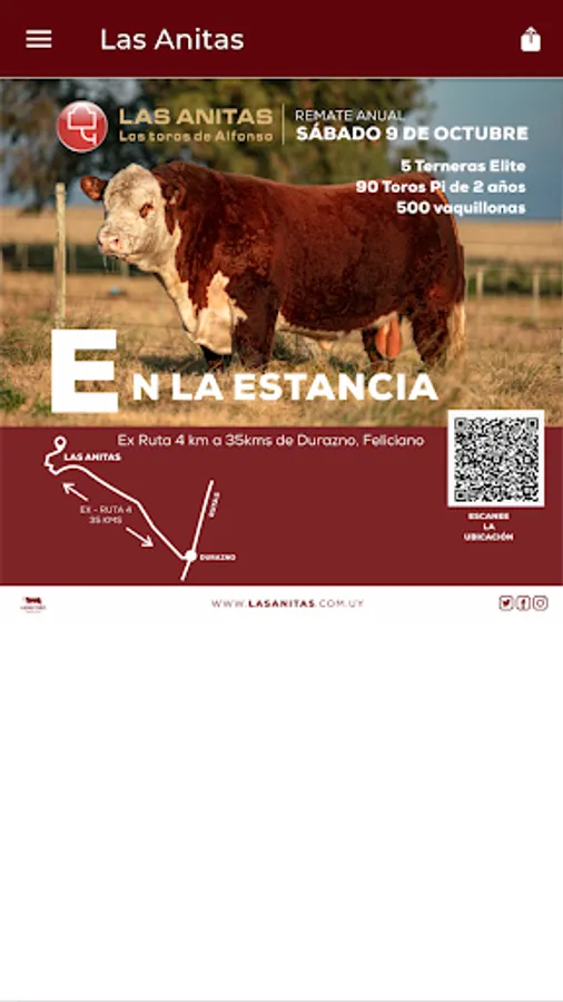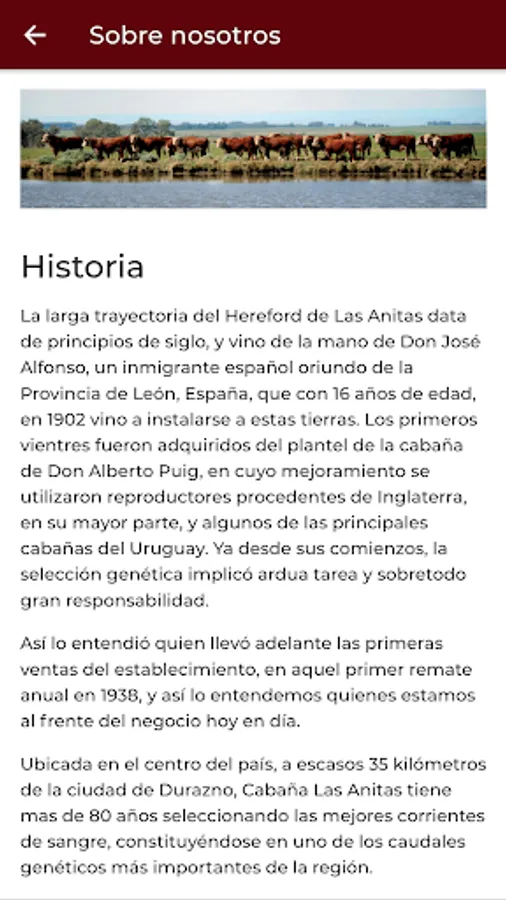 The long history of the Hereford de Las Anitas dates back to the beginning of the century, and came from the hand of Don José Alfonso, a Spanish immigrant from the Province of León, Spain, who at 16 years of age, in 1902 came to settle in these land. The first bellies were acquired from the Don Alberto Puig cabin, whose breeding used reproducers from England, for the most part, and some of the main cabins in Uruguay. From the beginning, genetic selection implied arduous task and above all great responsibility.