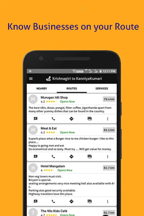 ✔️ Find pit stops along your route like restaurants for now. Very soon we will provide details of cafe, hotels, fuel stations , atms, hospitals, pharmacy, car repair, puncture shops, rest stop, religious places.