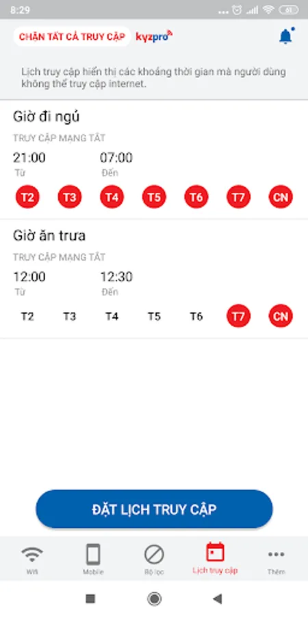 With Kyzpro, parents can still block / limit viewing according to a set schedule of content, websites, applications. Mobile devices will not be able to see the content of the block list wherever they are used. And only see according to the schedule has been installed calendar content.