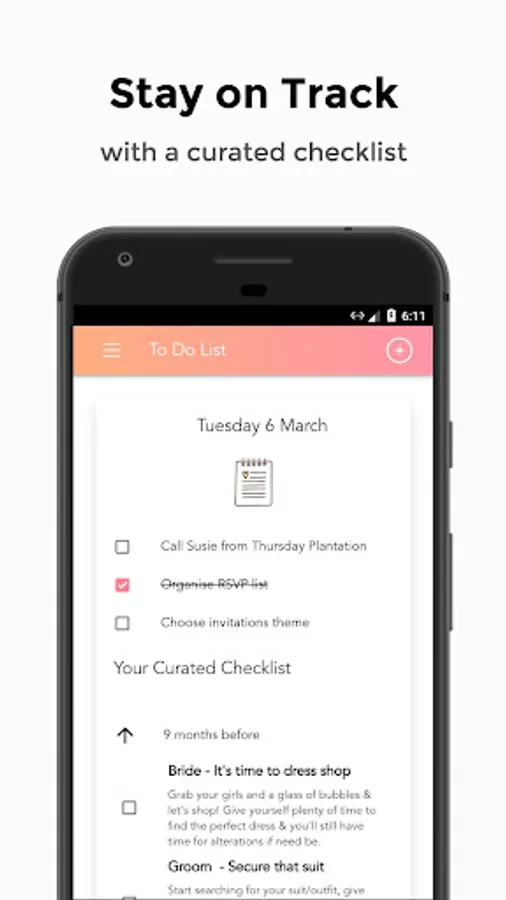 How can OurDay help you? - A simple, easy to use planner to keep you on track - OurDay will request your anticipated wedding date; from this you will receive a customised to-do list