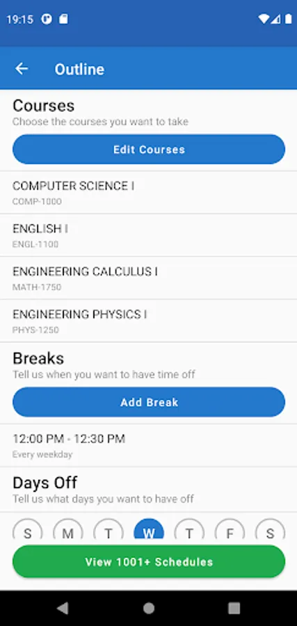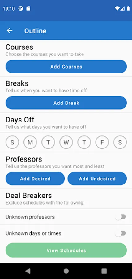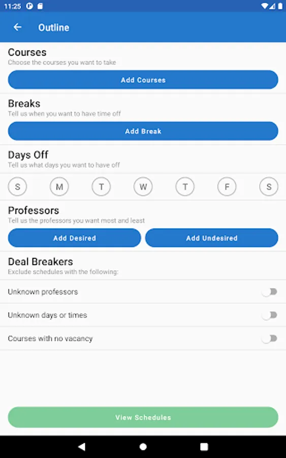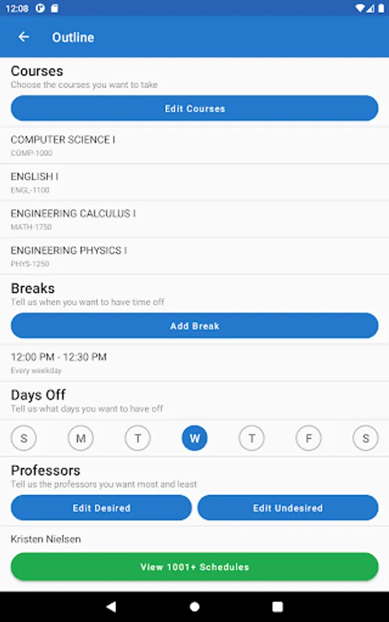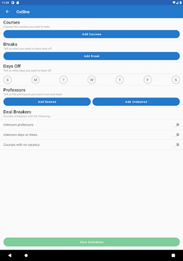 Take the hassle out of registration with ScheduleLab for Colleges! Our lightning-fast algorithm is able to process your needs and calculate the best choices available to you. Need a day off? Want to have your favorite professor? No problem! Just enter your preferences into the app and we’ll try to match them!