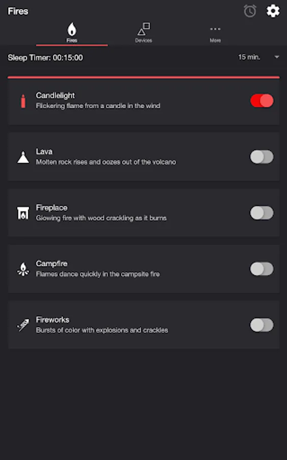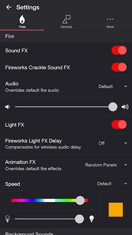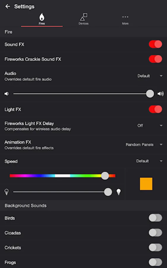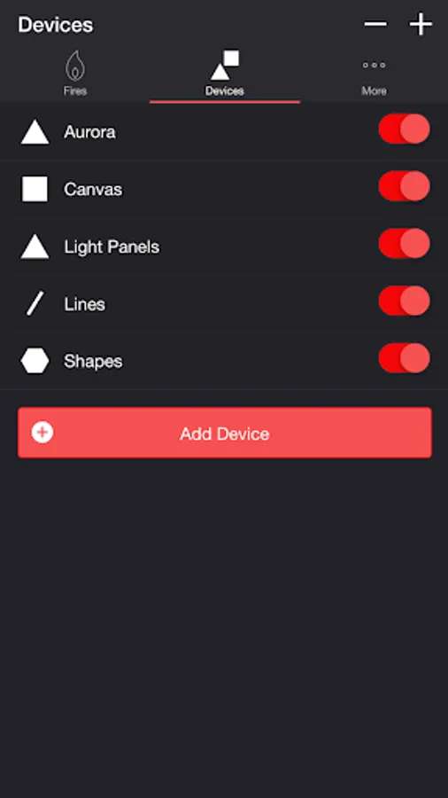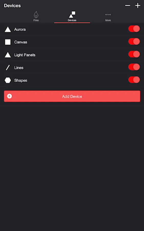 Add one or more of your Nanoleaf devices on the Devices tab. Toggle on the devices you want to use for your fire light show. To edit a device in the list, swipe the item to the left and tap the pencil icon.