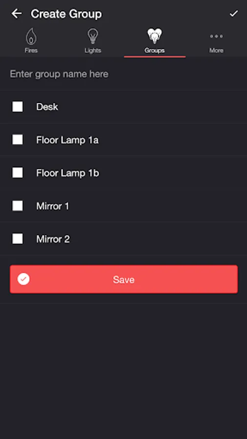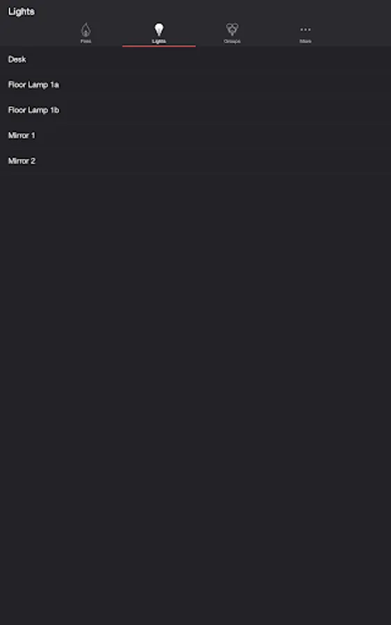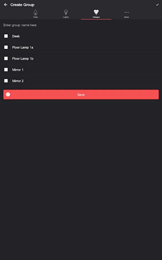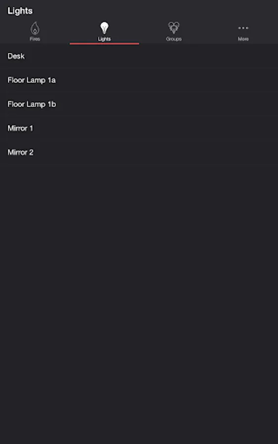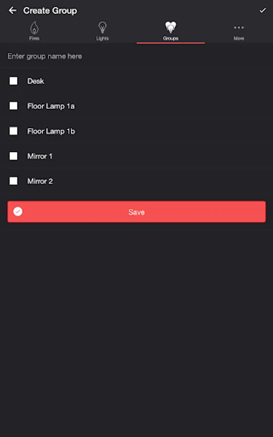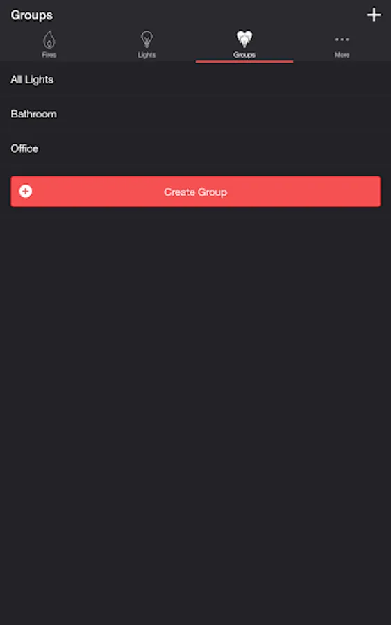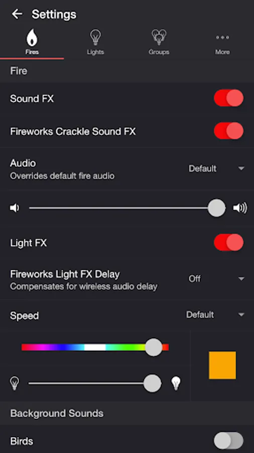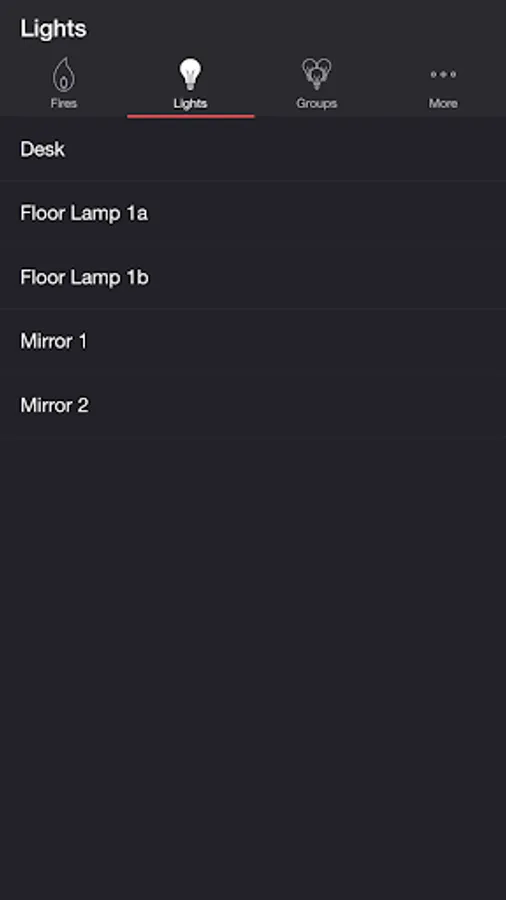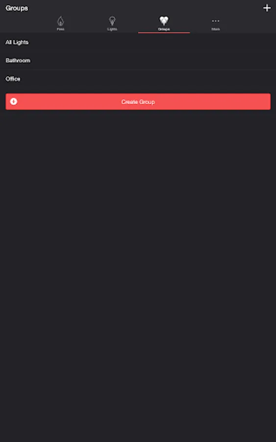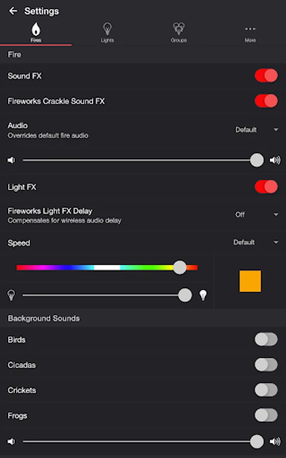 Select one or more lights for your fire light show on the Lights/Groups tab. Choose a group that you set up using your LIFX app, or create a new group in the Firestorm for LIFX app. To edit an in-app group in the list, swipe the item to the left and tap the pencil icon. When you add, remove, or change lights, pull down the list to refresh.