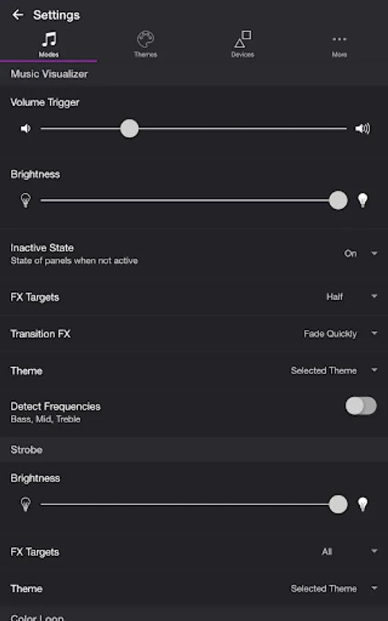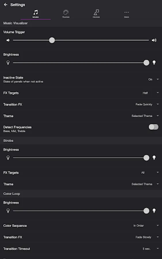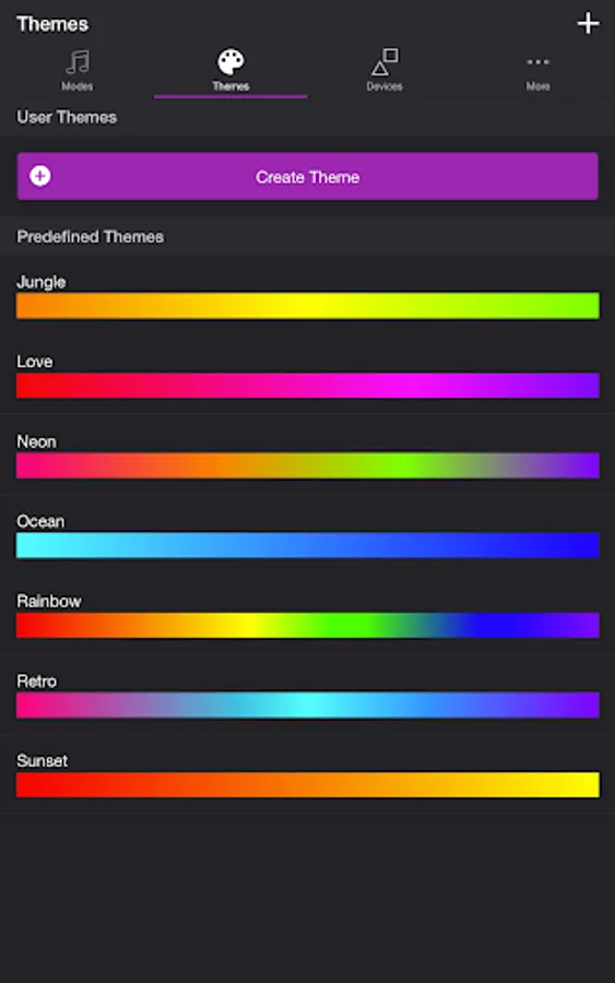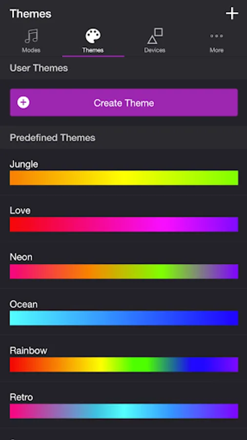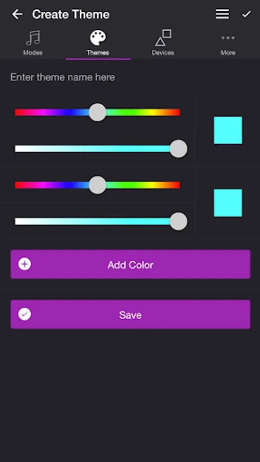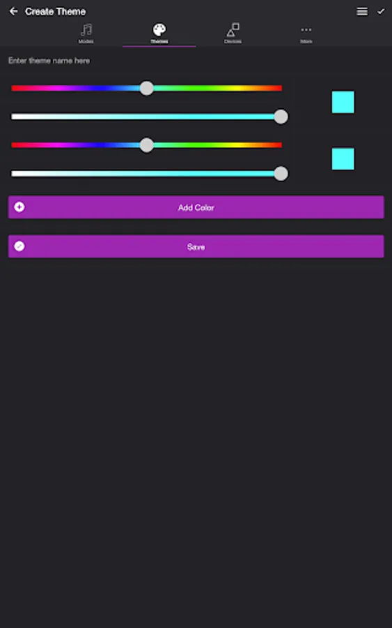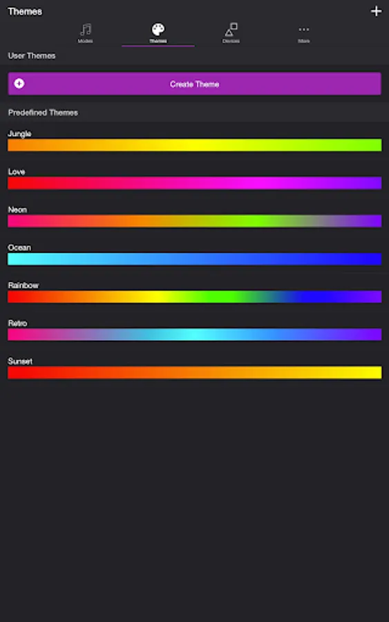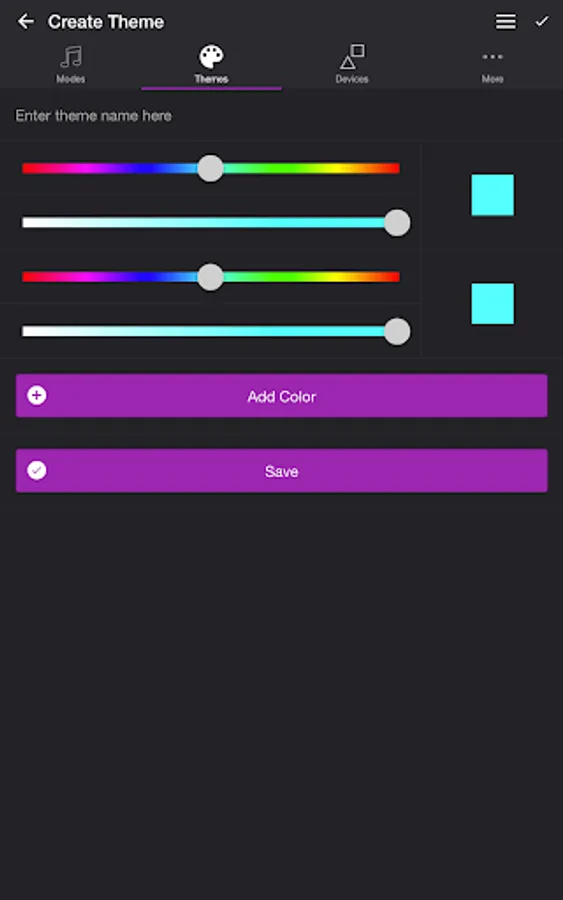 Choose from one of the predefined themes or create your own on the Themes tab. Each mode uses the colors in your theme. To edit a theme in the list, swipe the item to the left and tap the pencil icon. You can reorder colors for the Color Loop mode.