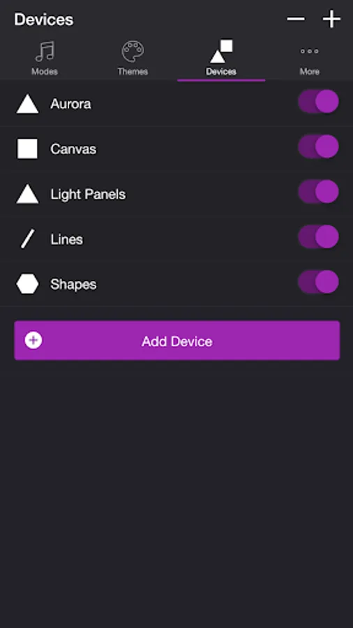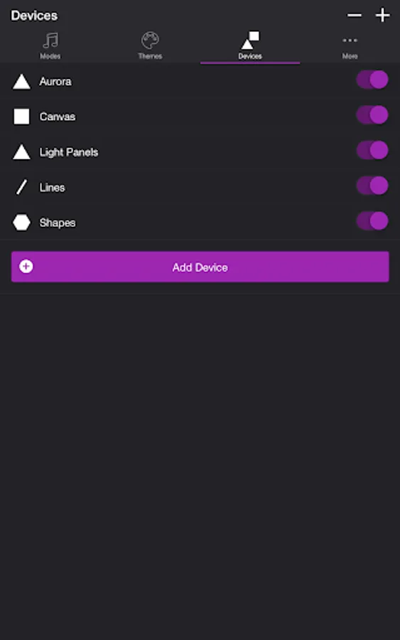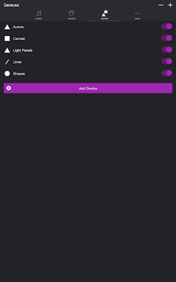 Add one or more of your Nanoleaf devices on the Devices tab. Toggle on the devices you want to use for your light show. To edit a device in the list, swipe the item to the left and tap the pencil icon.