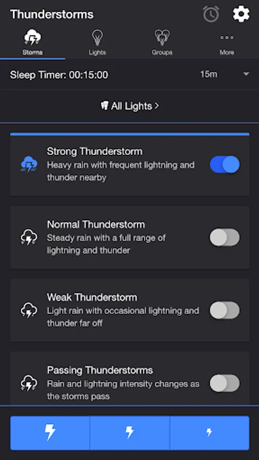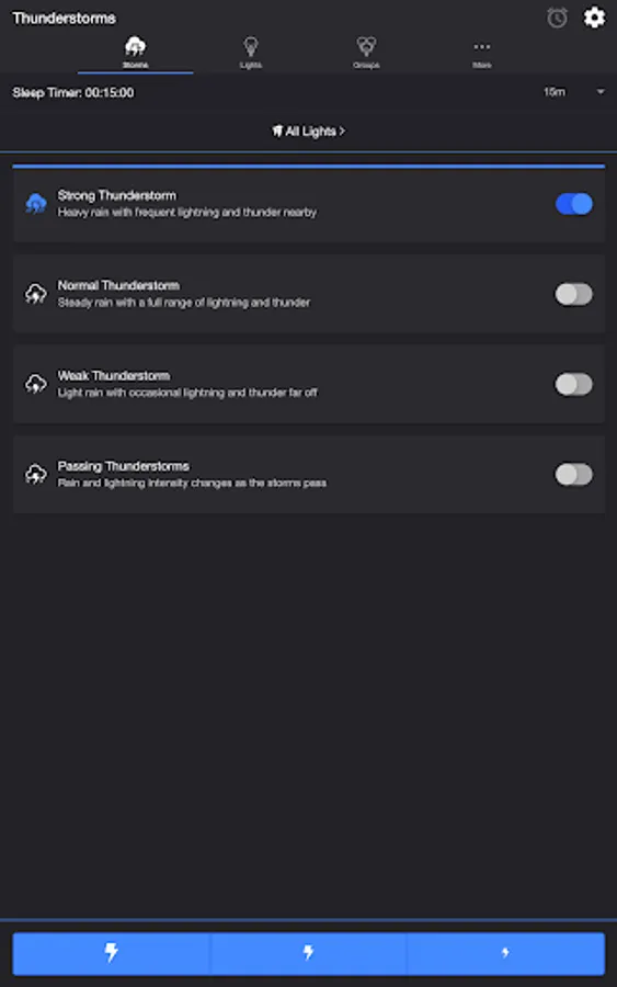 • Lightning on demand. Start a storm and tap one of the lightning buttons at the bottom of the page.