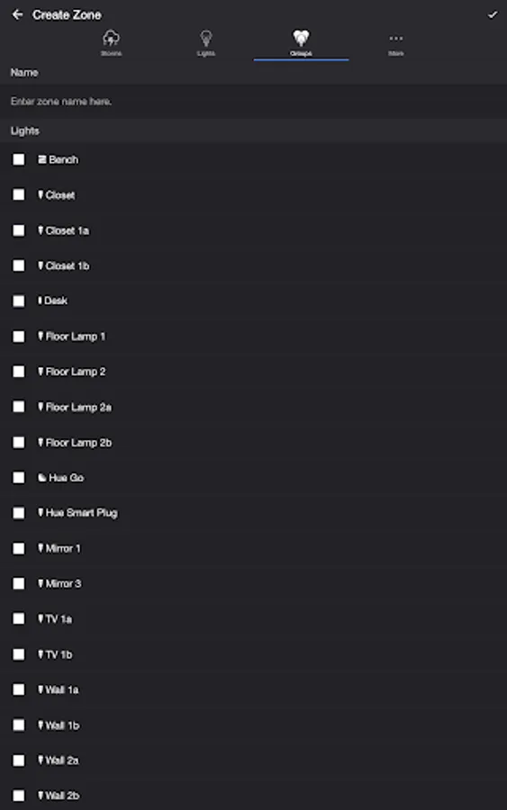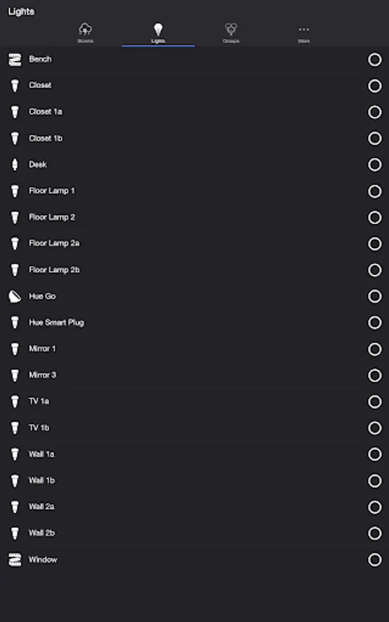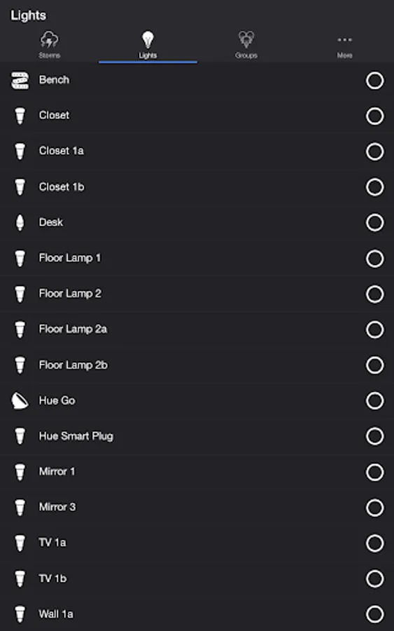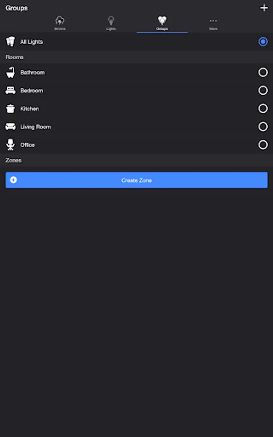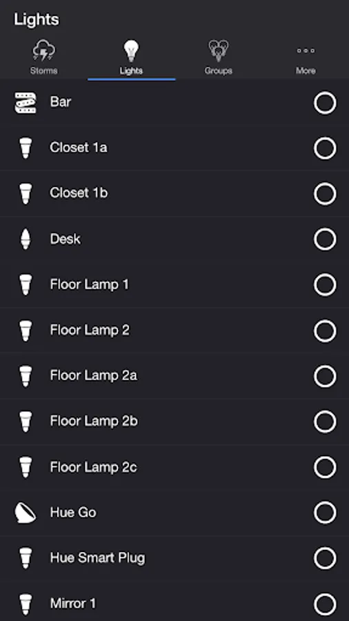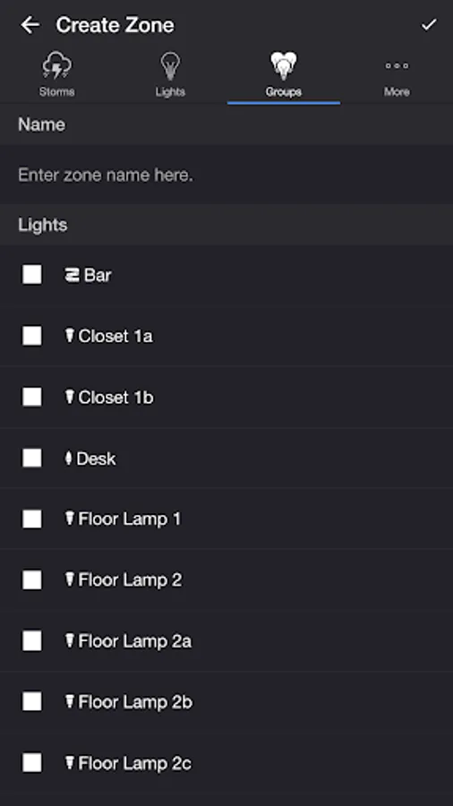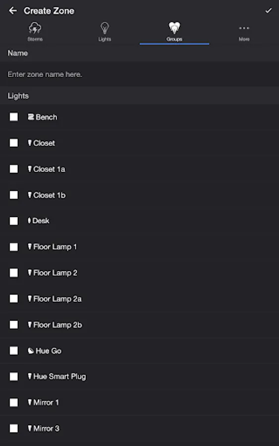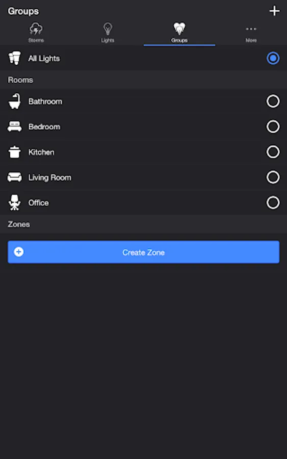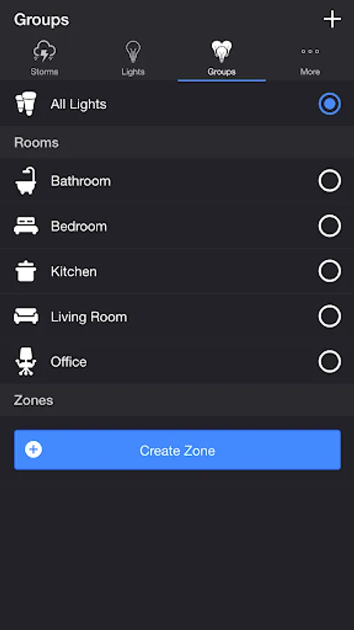 Select one or more lights for your thunderstorm light show on the Lights/Groups tab. Choose a group that you set up using the Philips Hue app, or create a new zone in the Thunderstorm for Hue app. To edit a zone in the list, swipe the item to the left and tap the pencil icon. When you add, remove, or change lights, pull down the list to refresh.
