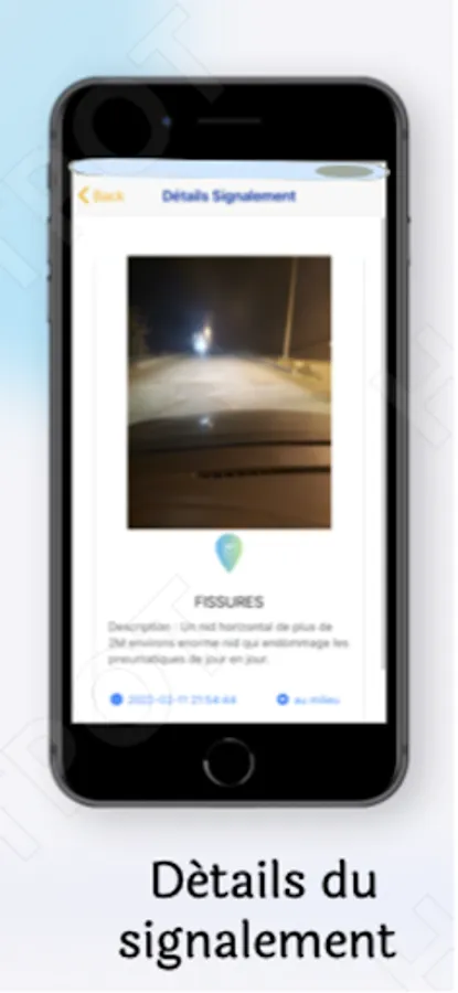 The witness can finally write a text to describe the degradation and any damage identified on the road (potholes, cracks, dangerous speed bumps and obstacles), the signs (absence of markings, absence of signs, narrow road and roadworks). ), the lighting to report (public lighting, traffic lights, accidents and others) and publish a photograph of the place.