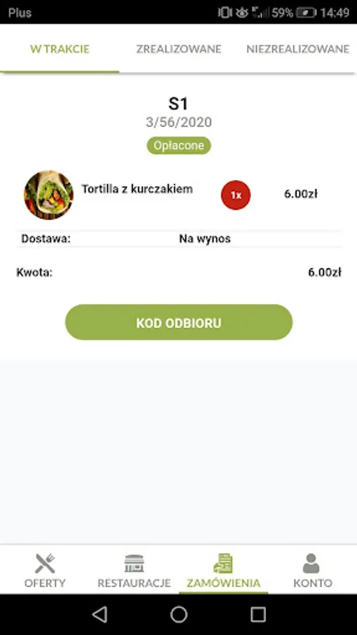 The user receives take-out food at a specified time.