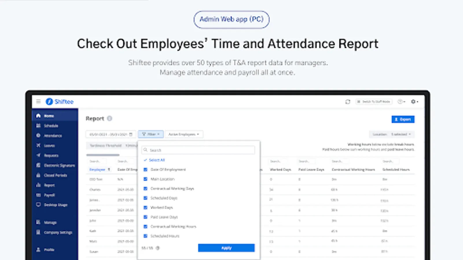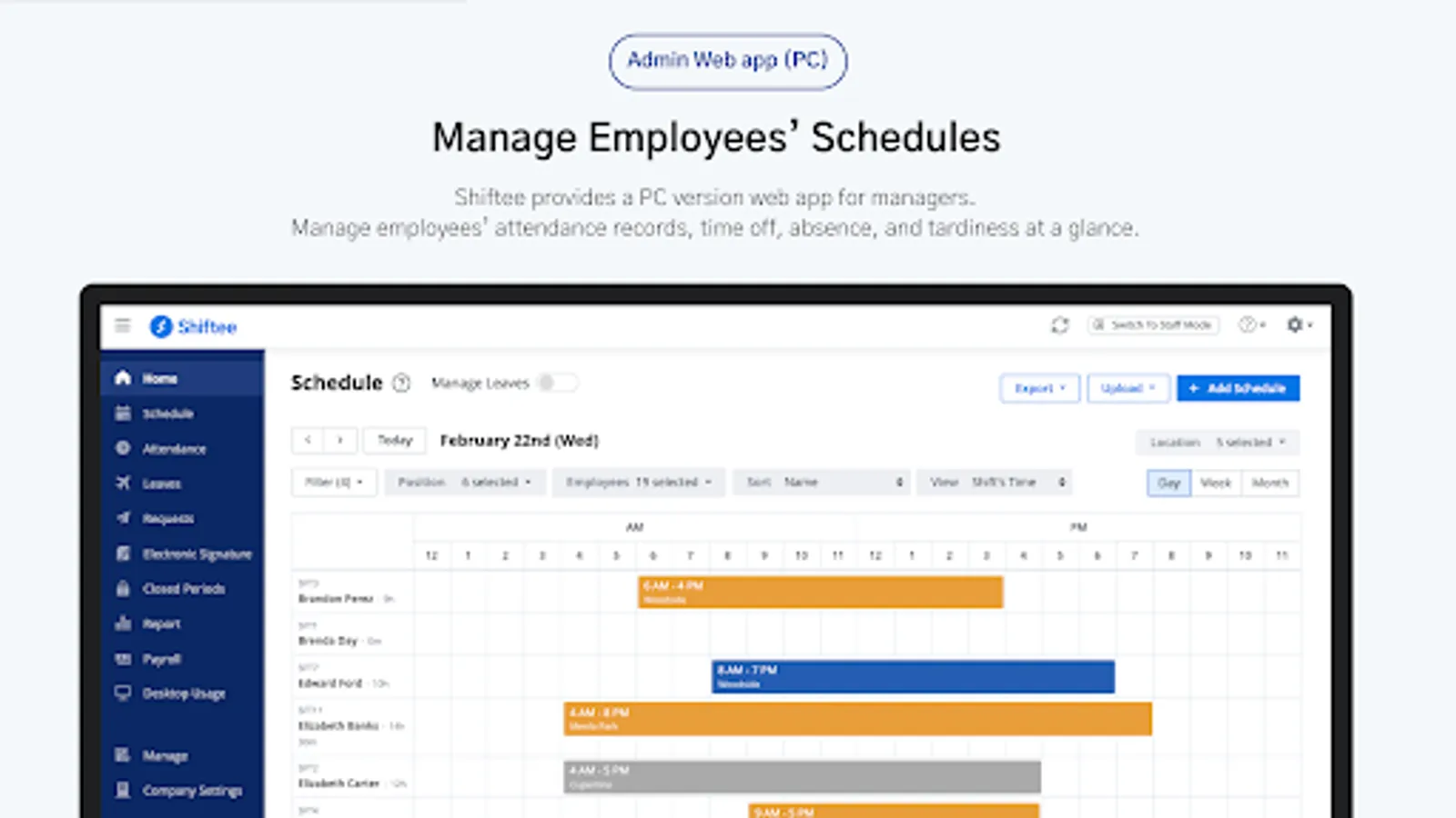 Shiftee is a complete workforce management software with powerful tools for employee scheduling, shift planning, time and attendance, and leave management, workflow, e-contract, and payroll.