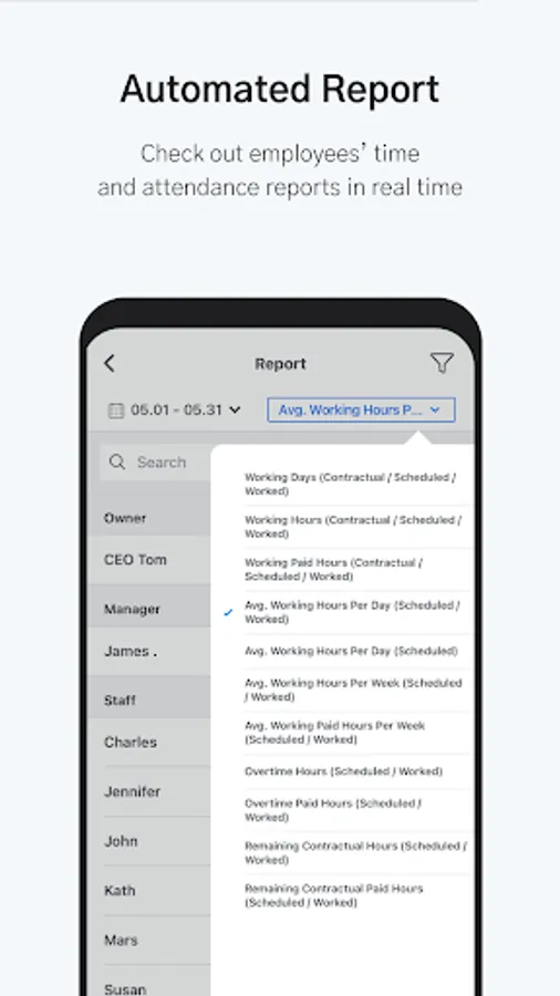 View total work hours, overtime work hours, night work hours, and many more real-time data with a simple touch of a finger.