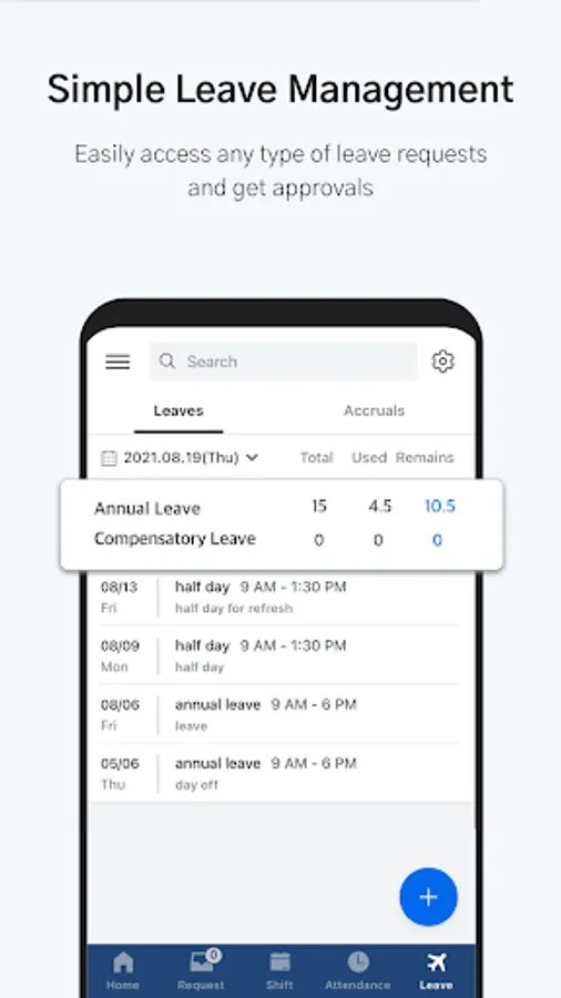 Make leave requests on mobile and view past leaves easily anytime anywhere.
