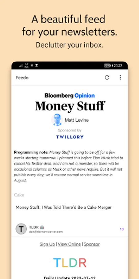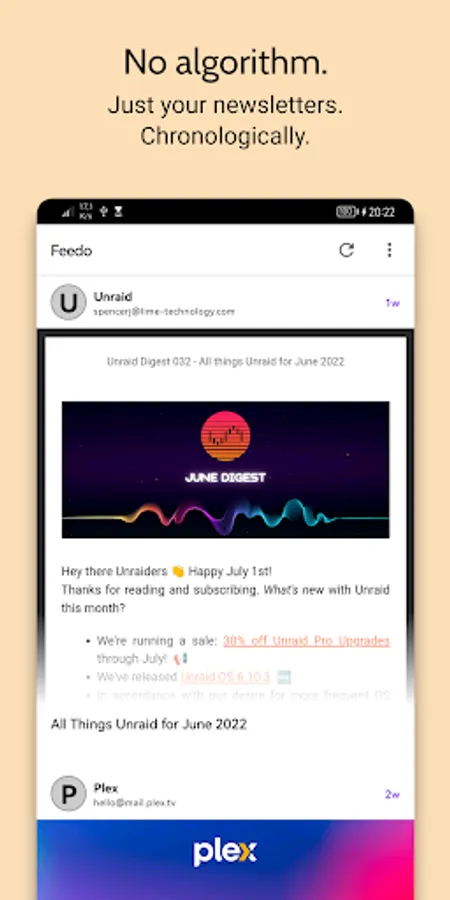 Feedo cleverly finds the newsletters in your inbox, and presents them beautifully. Works with your current email account, and all your newsletters. Substack and Revue included.