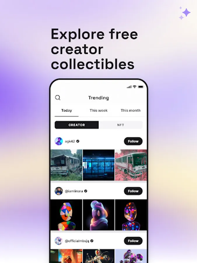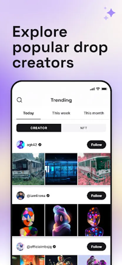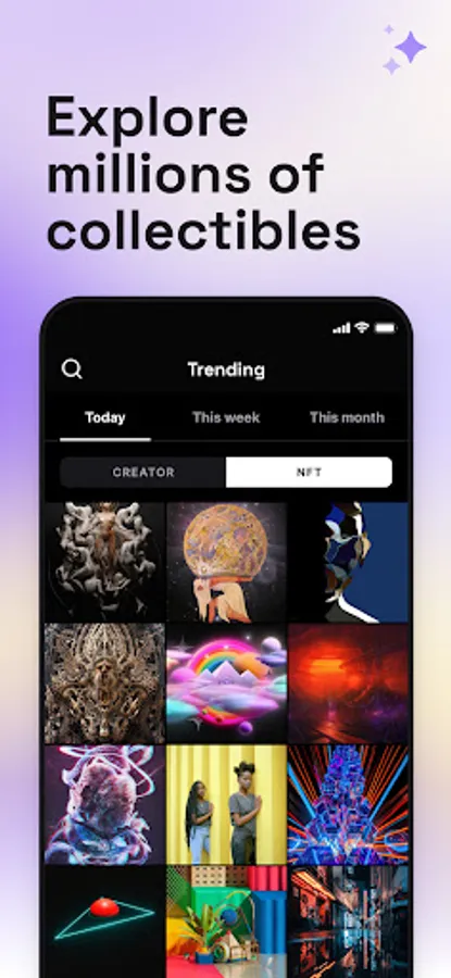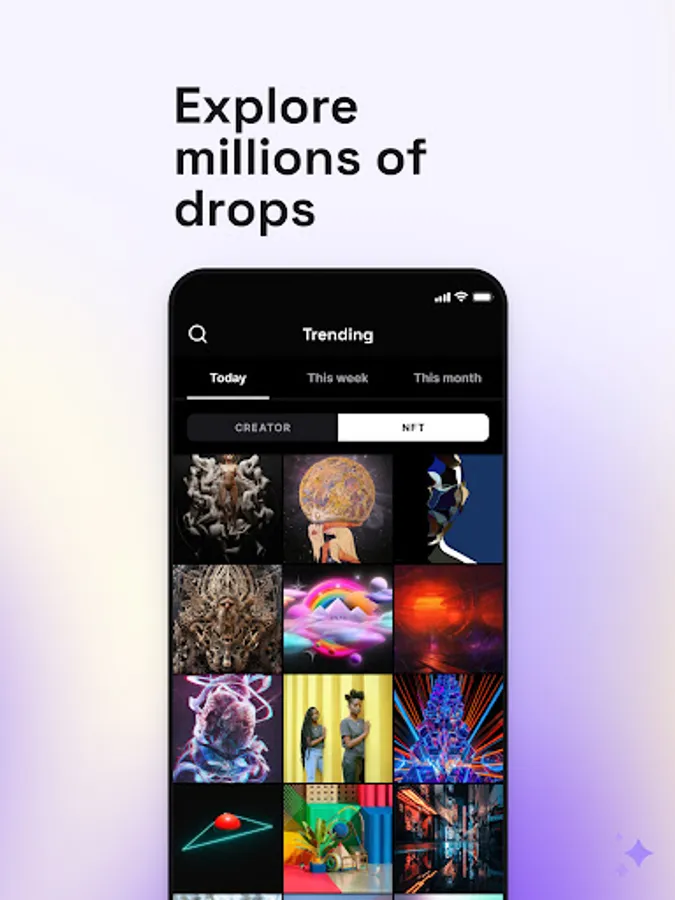 ✦ TRENDING CREATORS AND COLLECTIONS: Spot drops as soon as they rise in popularity thanks to our Trending tab, ranked by day, week and month.