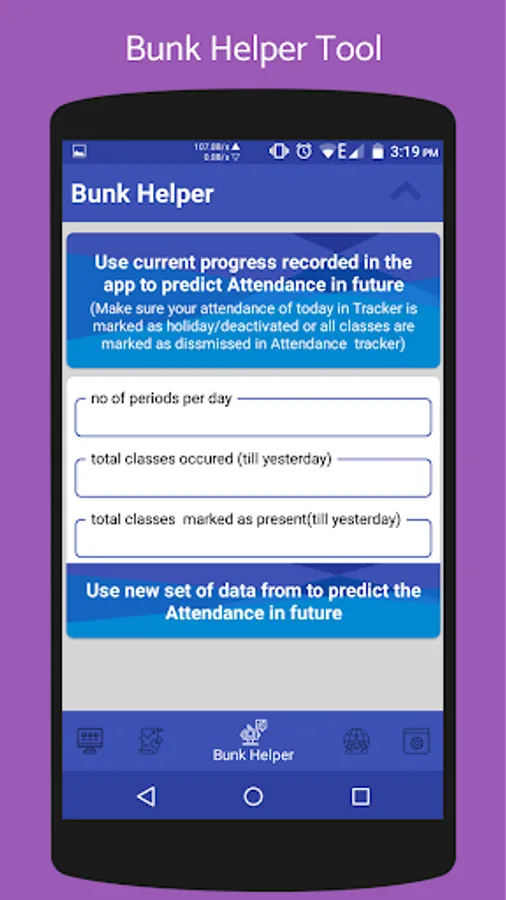3.BUNK HELPER TOOL: This tool is useful if someone wants to know his/her attendance after bunking some classes/lectures.This tool makes the process more easier with just few no of clicks.