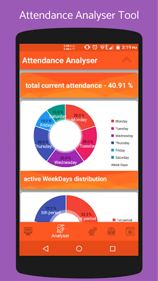 2.ATTENDANCE ANALYSE TOOL :This tool provides various graphs to show every aspect of your attendance.The graphs are made from the data fed in TRACKER tool.