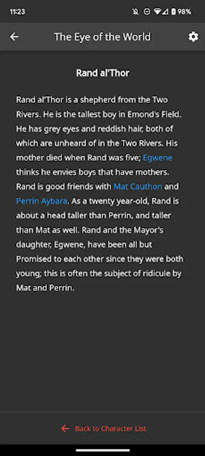 Read about any character's history up to the book you're on! Simply select a book, and search for a character!