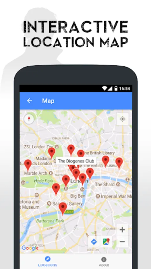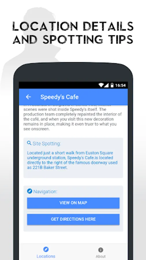 • Interactive location map – pinpointing all Sherlock filming locations and your location; integrating walking, public transport and driving directions