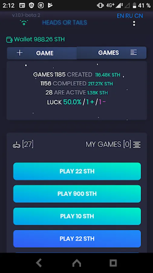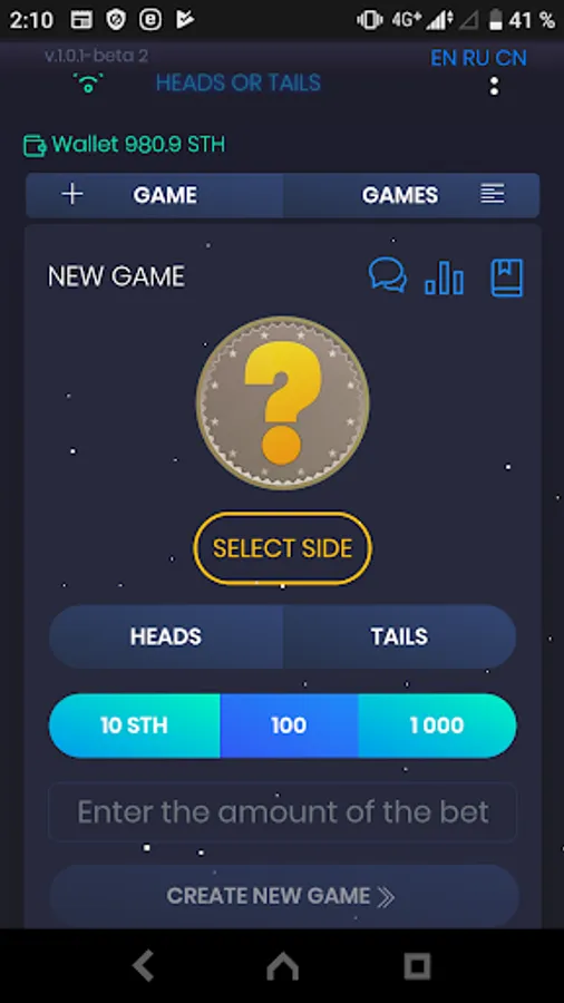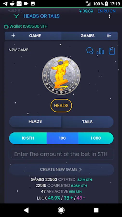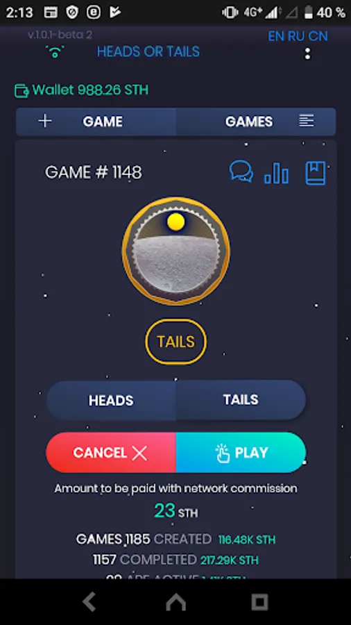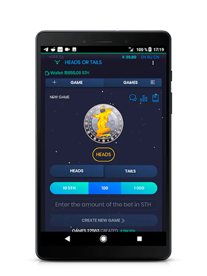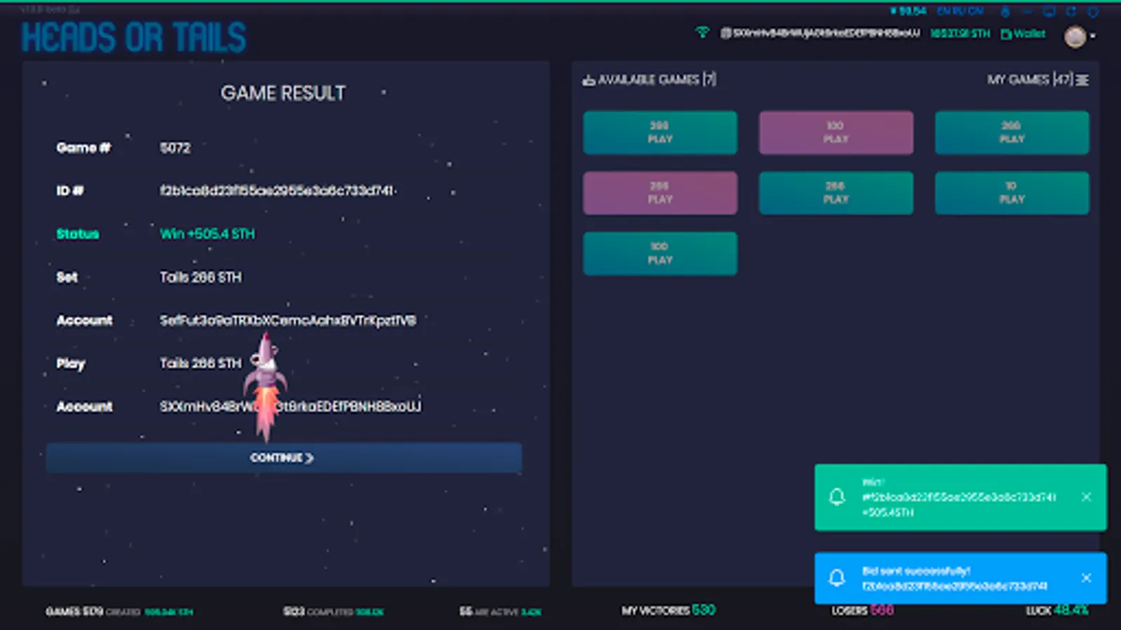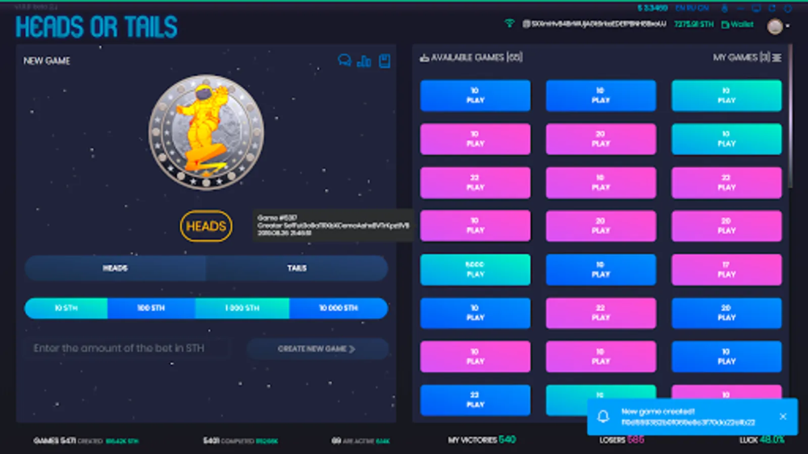 You can start a new game with your own stake or choose an existing one by choosing one “Heads” or “Tails” side of the coin.