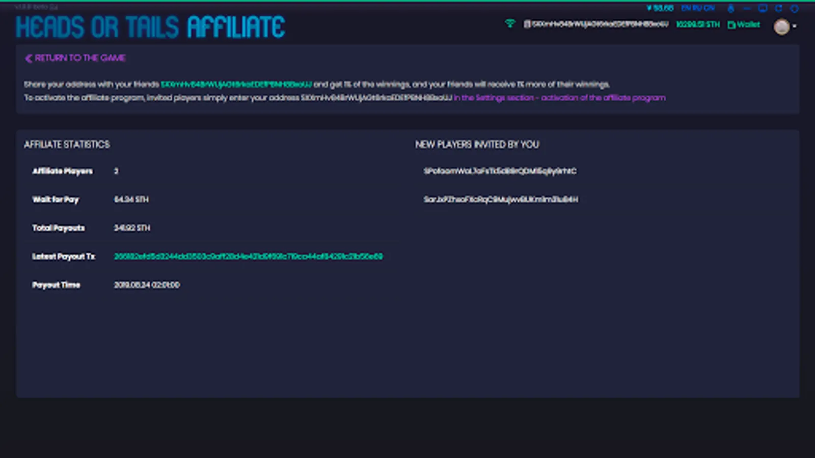 An affiliate program is built into the game that allows you to play and earn at each player through the distribution of your referral link. Share your address in the game with your friends !Your address in the game is your affiliate code! and get 1% of your friends ’winnings, and your friends will get 1% more for your winnings!