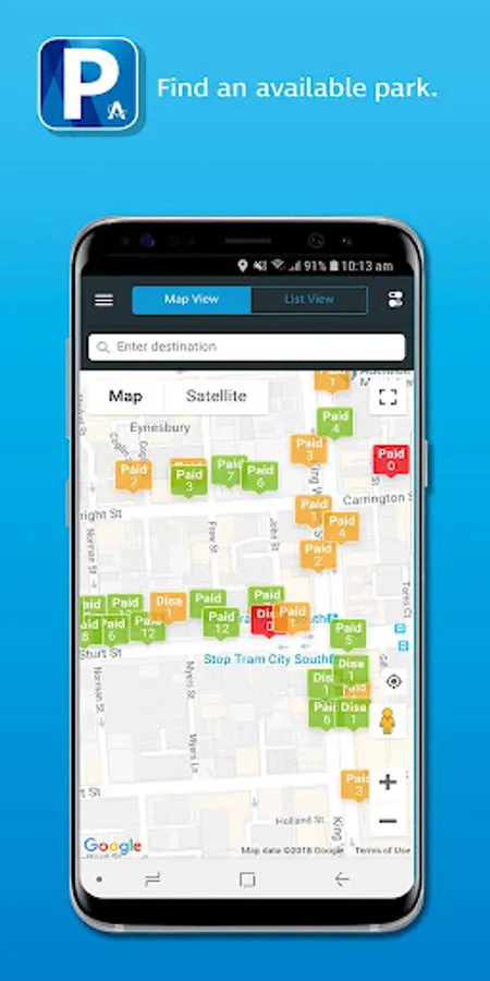 Tapping a map marker will give you more information about the parking controls in that area. This includes hours of operation, time limits, parking fees, and other restrictions. By typing in your destination, the app can display and guide you to available parking options nearby.