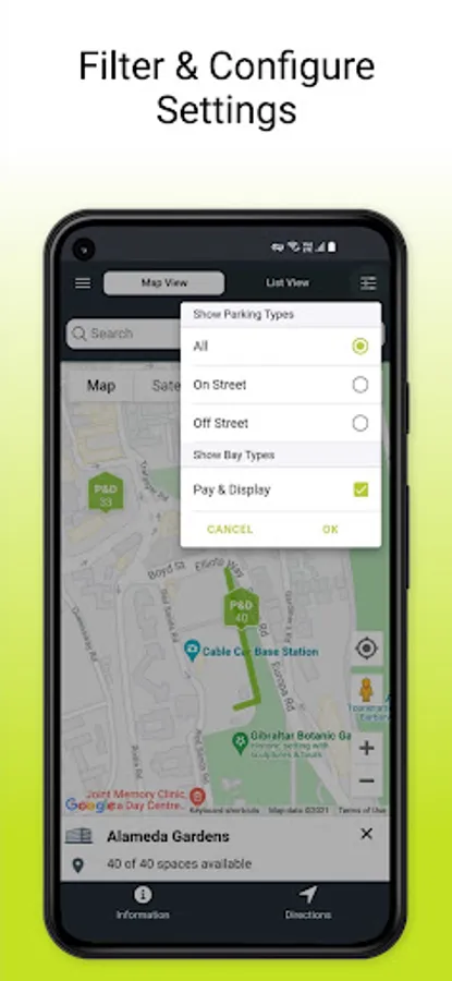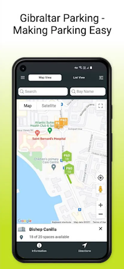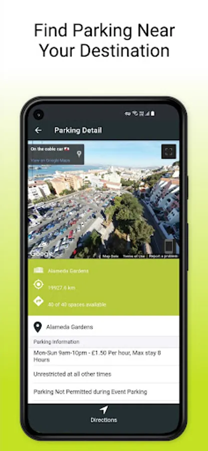 You can find parking spaces either by entering an address or using your current location. You can also see alternative parking places near your preferred destination. You can also get directions to your selected parking location by clicking the directions option which connects the Gibraltar Parking app to the turn-by-turn application that you already have available on your smartphone.