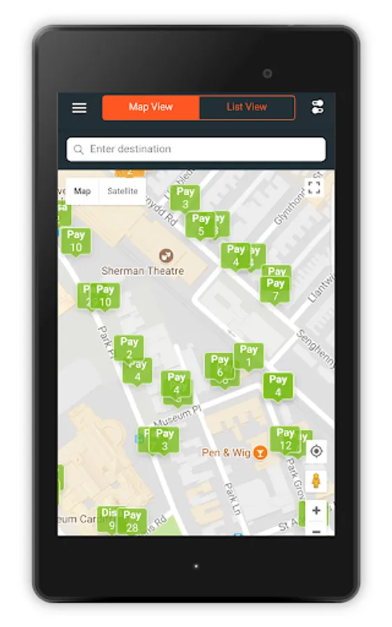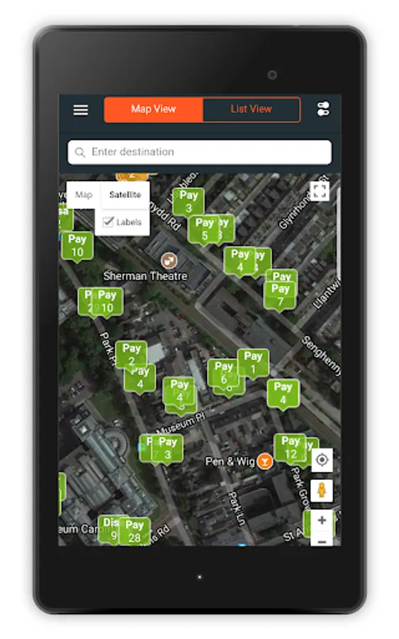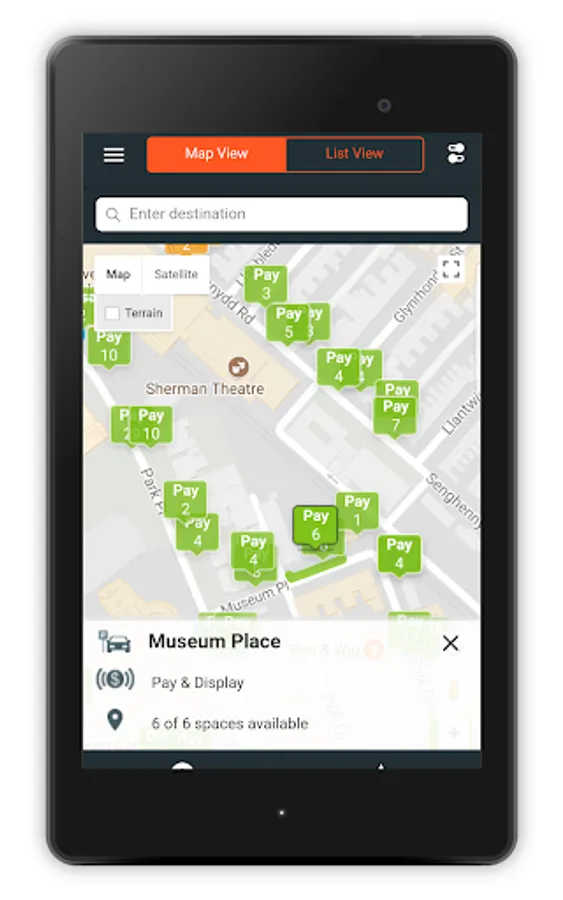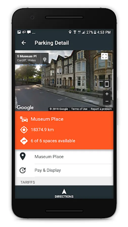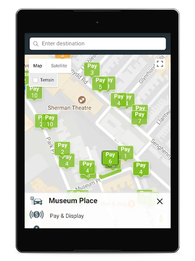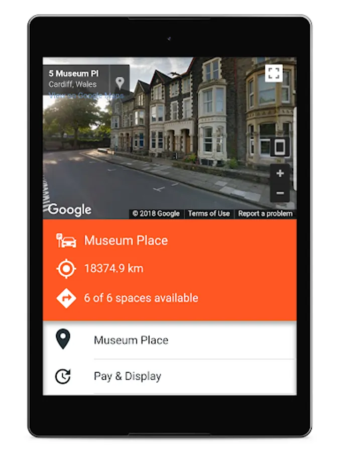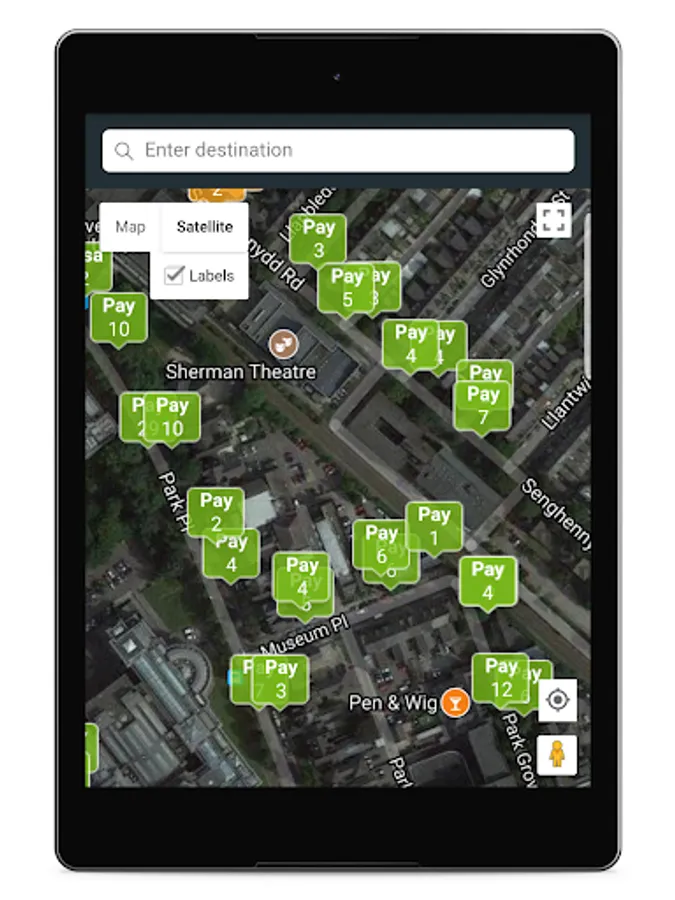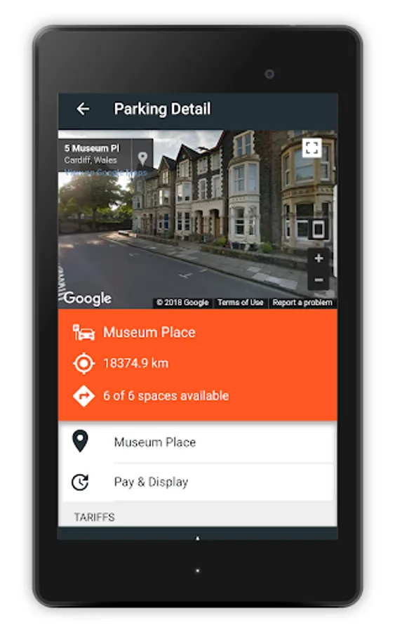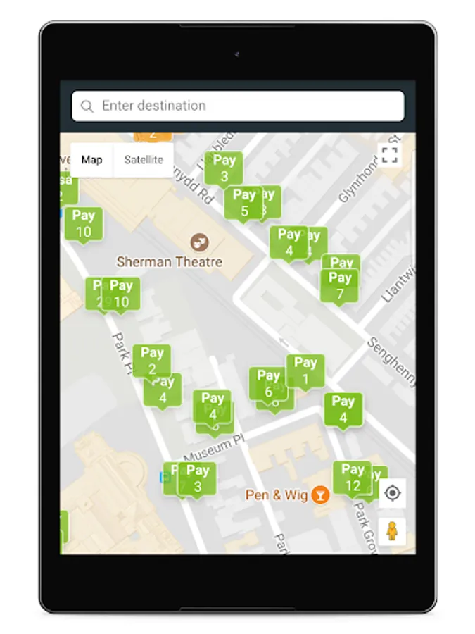 Each parking area marker on the map displays a colour and the number of available parking spaces. Simply tapping a map marker will reveal details of the parking spaces in that particular area. This will show you details about the parking spaces such as the hours of operation, tariffs, and other features.