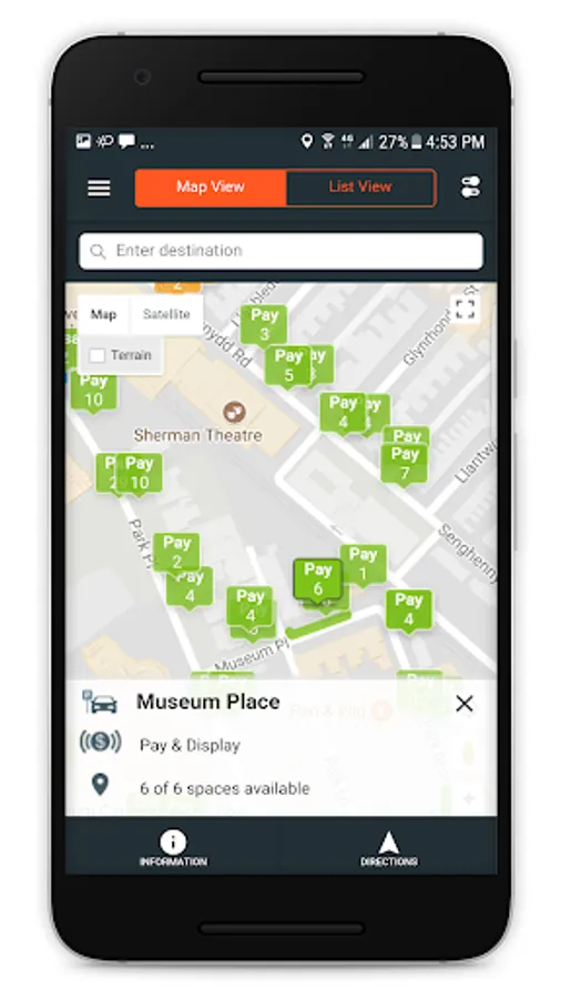 You can find parking spaces either by entering an address or using your current location. You can also see alternative parking places near your preferred destination. You can also get directions to your selected parking location by clicking the directions option which connects the Smart Parking app to the turn-by-turn application that you already have available on your smartphone.