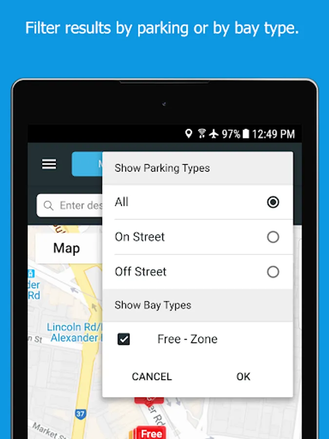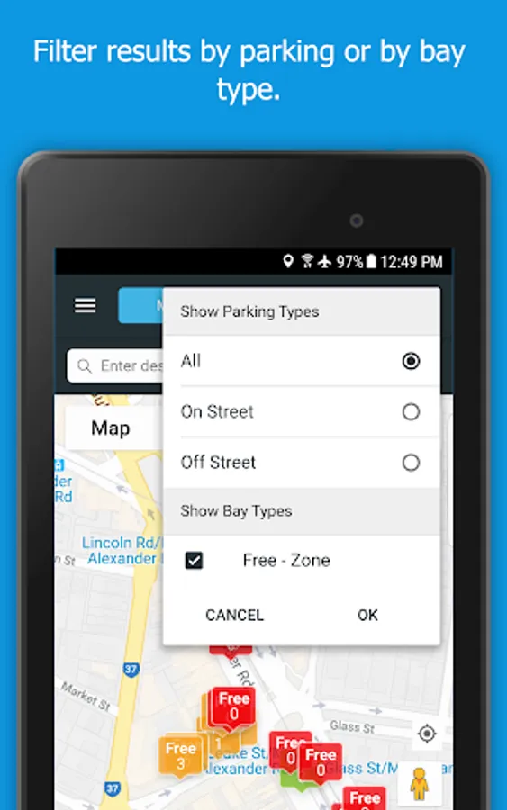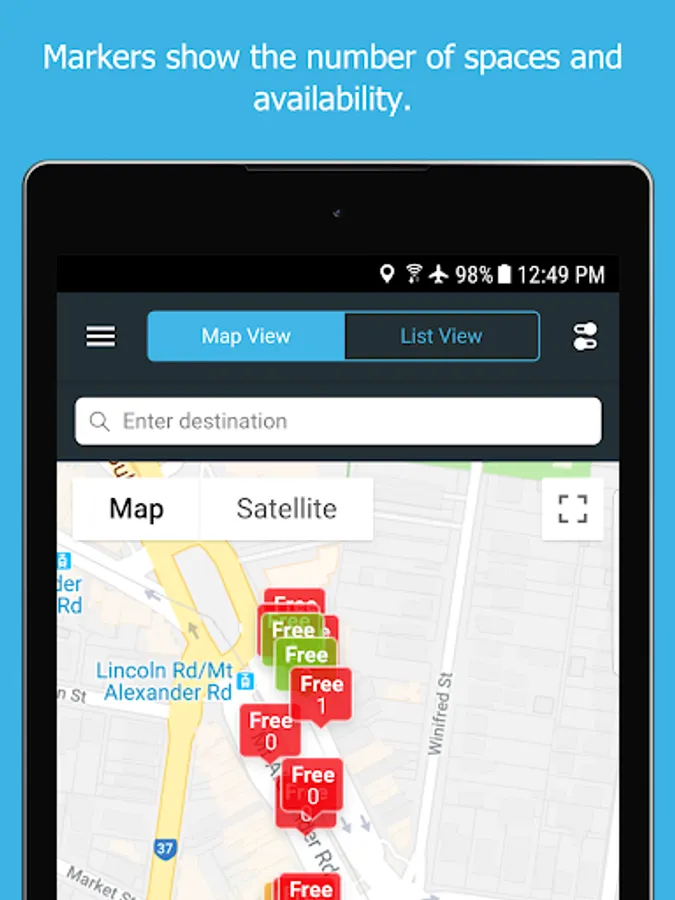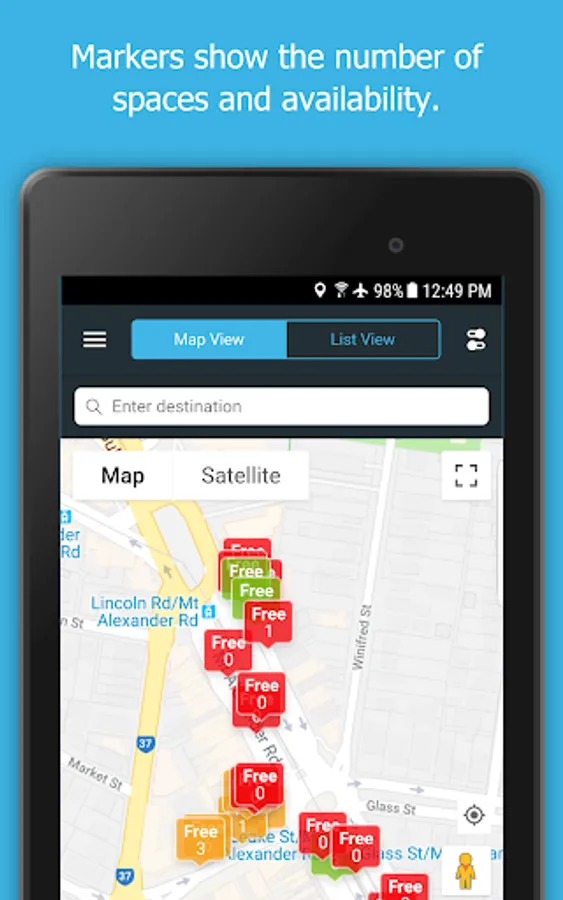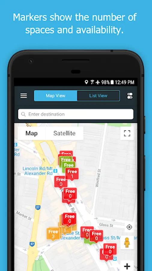 Tapping a map marker will give you more information about the parking controls in that area. This includes hours of operation, time limits, parking fees, and other restrictions. By typing in your destination, the app can display and guide you to available parking options nearby.