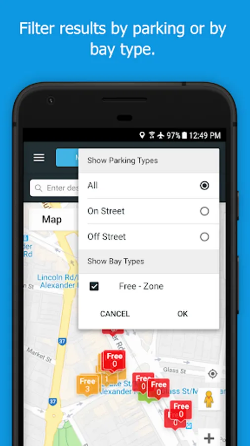 To find available parking, open the app to reveal the city map. The coloured markers (red, green, and amber) indicate the number of parks which are available.