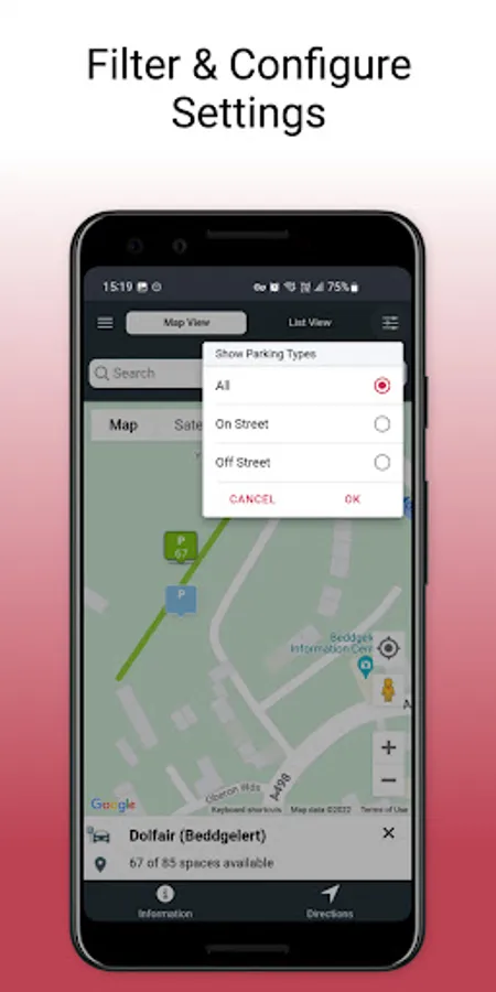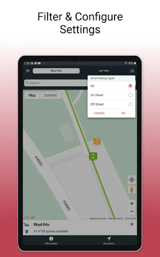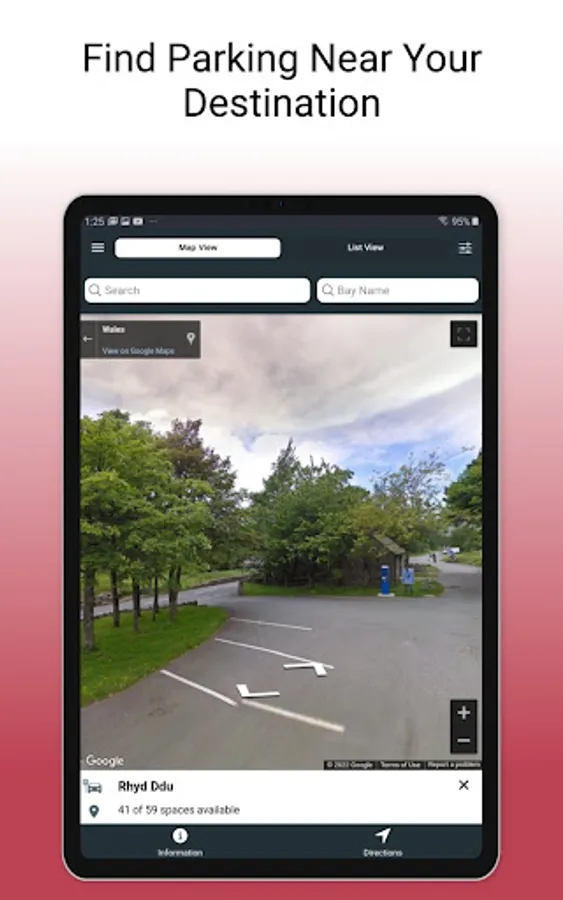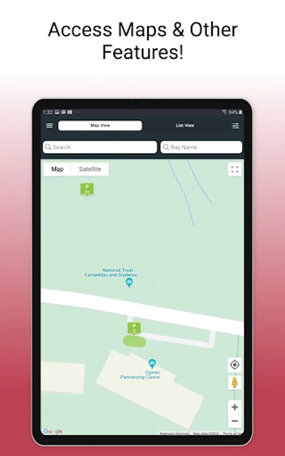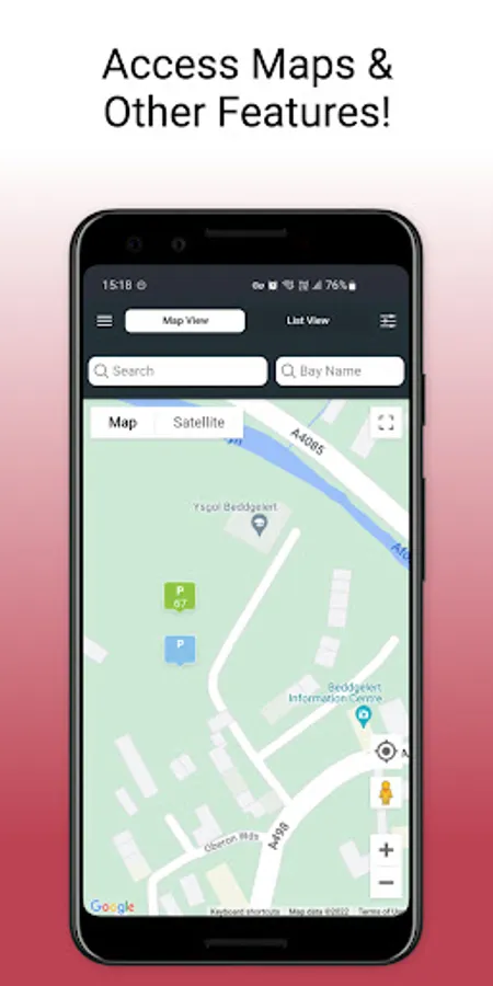 I ddarganfod lle parcio, agorwch yr ap i arddangos y map. Bydd yr eiconau lliw (coch, gwyrdd ag oren) yn cyfeirio tuag at y nifer o lefydd parcio sydd ar gael.