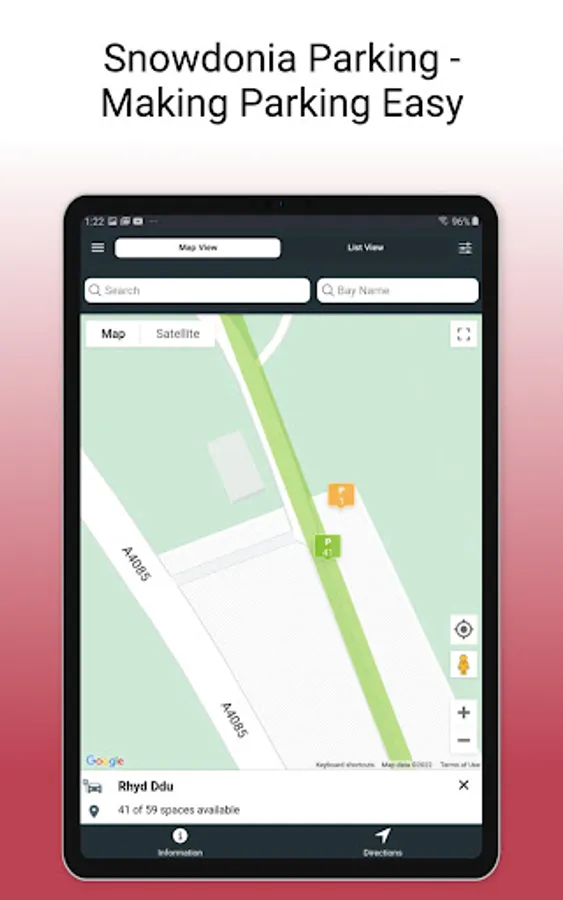 Bydd tapio eicon ar y map yn rhoi mwy o wybodaeth i chi am drefniadau parcio yn yr ardal honno. Mae hyn yn cynnwys oriau gweithredu, arosiadau, ffioedd parcio a chyfyngiadau eraill os yn berthnasol.