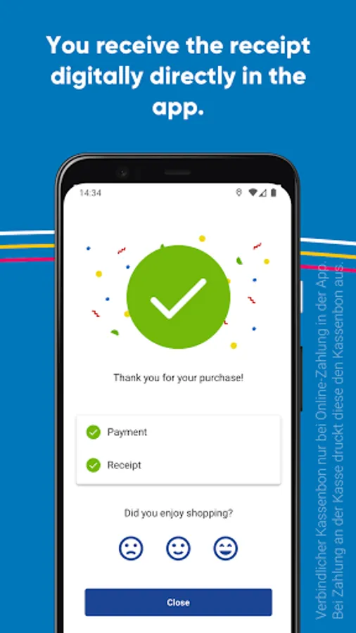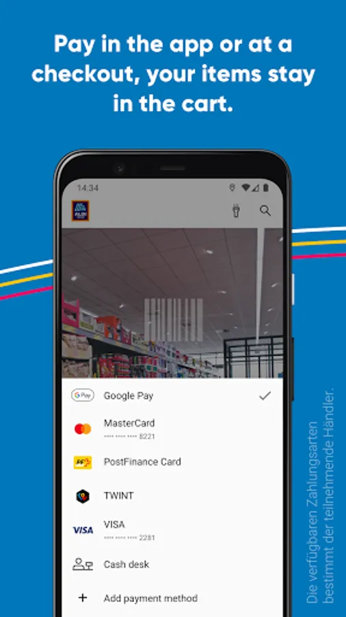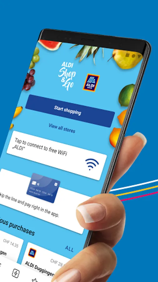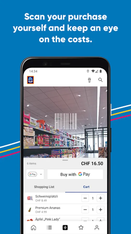 Visit a participating store and hold the barcode of products you want to buy into the camera. Simply do it while you shop. All products end up in a shopping cart in the app - now just pay and leave the store. Without standing in the checkout line and without putting the products on the checkout belt. That's how shopping works today.