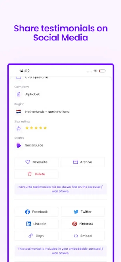 You’ll receive an email notification for each new testimonial on your SocialJuice dashboard, so nothing slips through the radar.