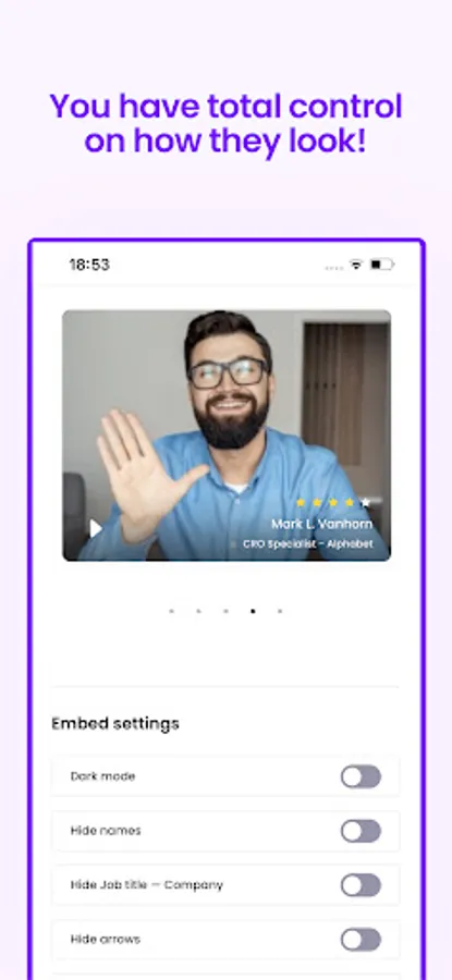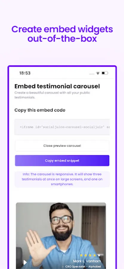 Customize the embedded carousel to control how you want the testimonial information to be displayed, such as highlighting individual and company names.