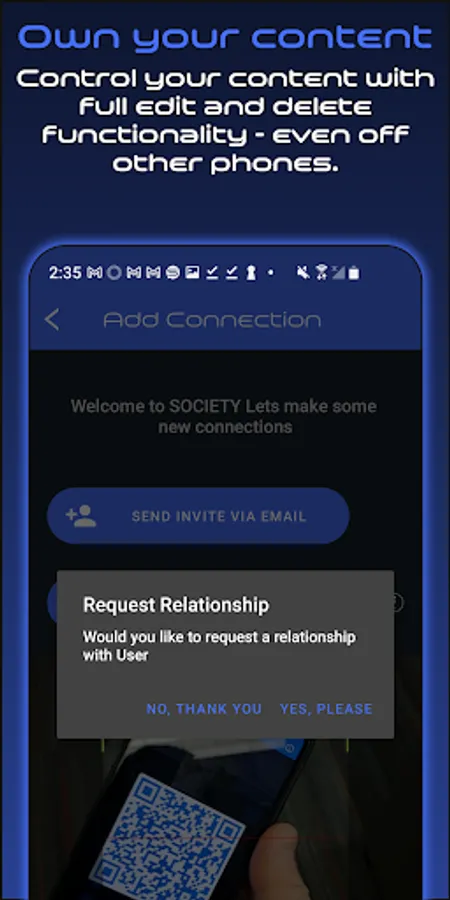 OWN YOUR CONTENT: On SOCIETY you own your data. That means you have the power to edit and delete sent messages at all times on all phones, prevent forwarding of your chats to unwanted people, and you control who sees your content.