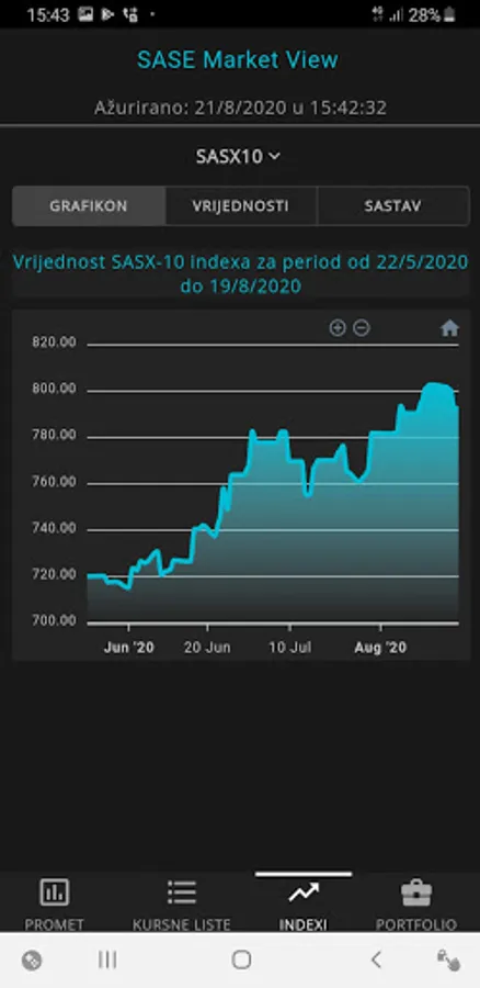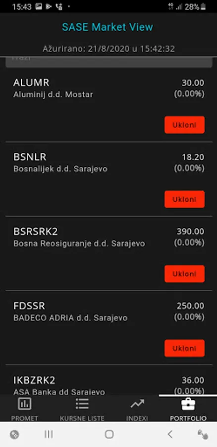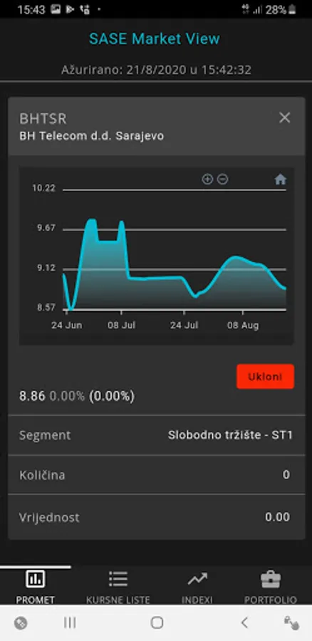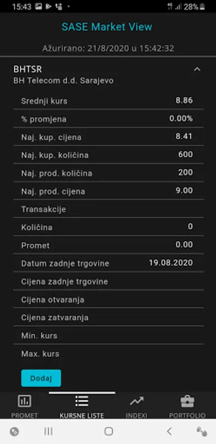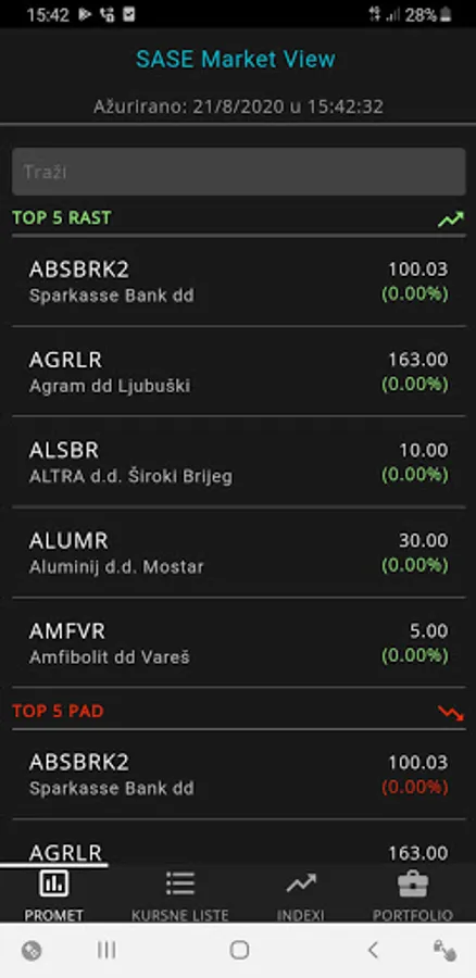 SASE Market View is a mobile application with which you can follow live trading on the Sarajevo Stock Exchange, have an insight into the prices of securities and other data with trading charts, indexes and create your own portfolio for monitoring.