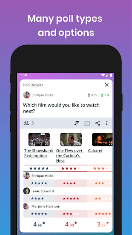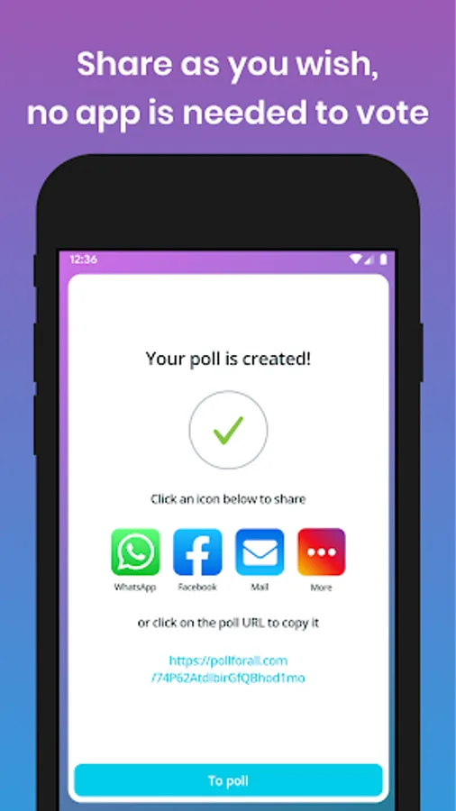 Sharing - Invite your friends to vote via your favorite messenger, social networks, email or by showing and scanning poll's QR-code. There is no need to have the app installed for voting!
