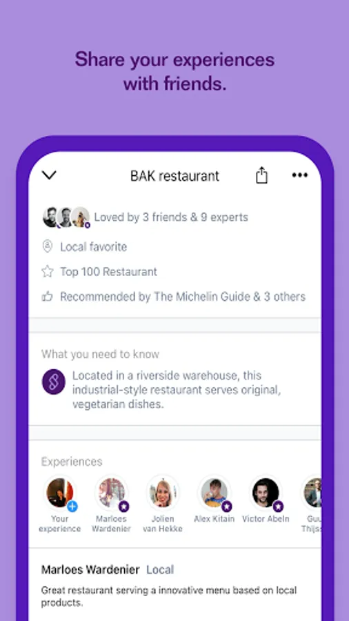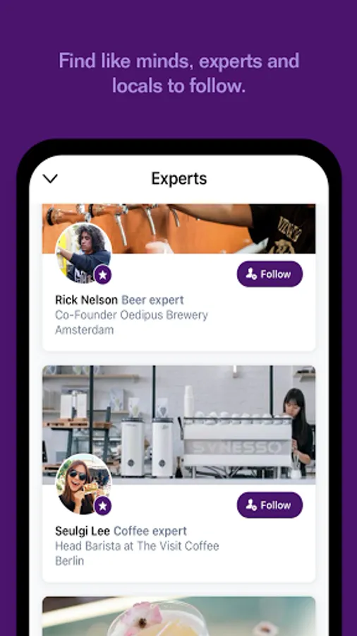 • Find like minds, and become part of a community. Follow experts, friends, and locals with similar tastes or interests.