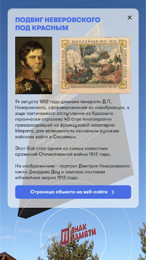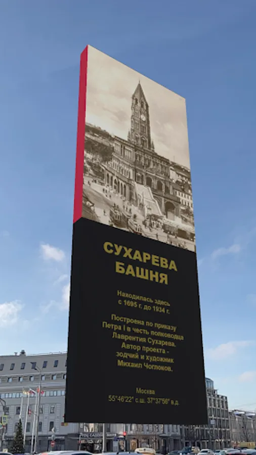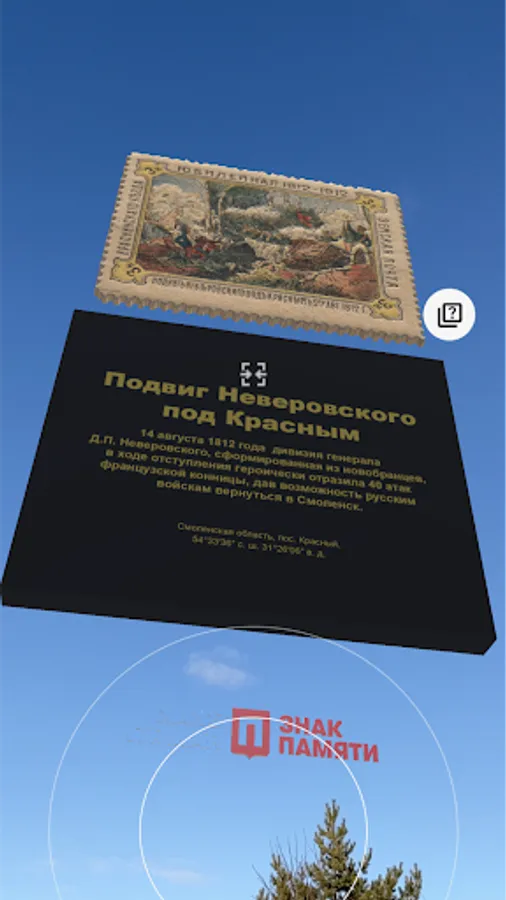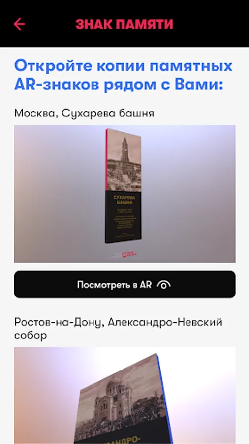 An augmented reality layer on the territory of Russia, in which virtual commemorative signs are placed according to GPS coordinates in honor of the lost objects of cultural heritage - monuments of history and culture, as well as other 3d objects (photo and video installations, reconstructions, exhibitions) dedicated to historical events. In this layer, the user finds AR objects using radar, examines them, takes photos and videos, and receives additional information about objects without leaving the augmented reality mode.